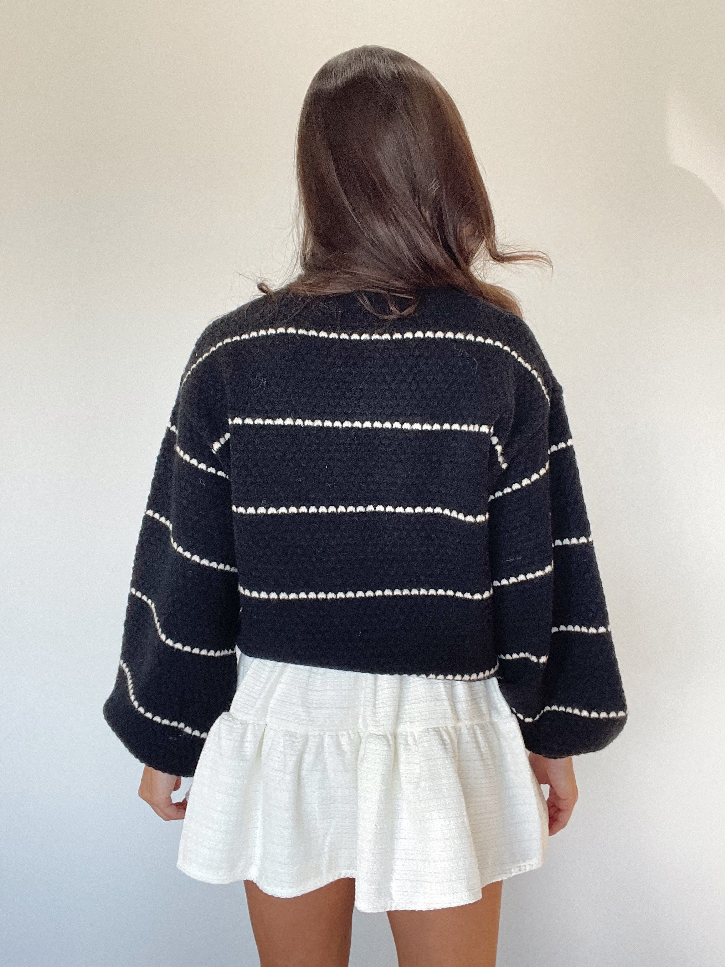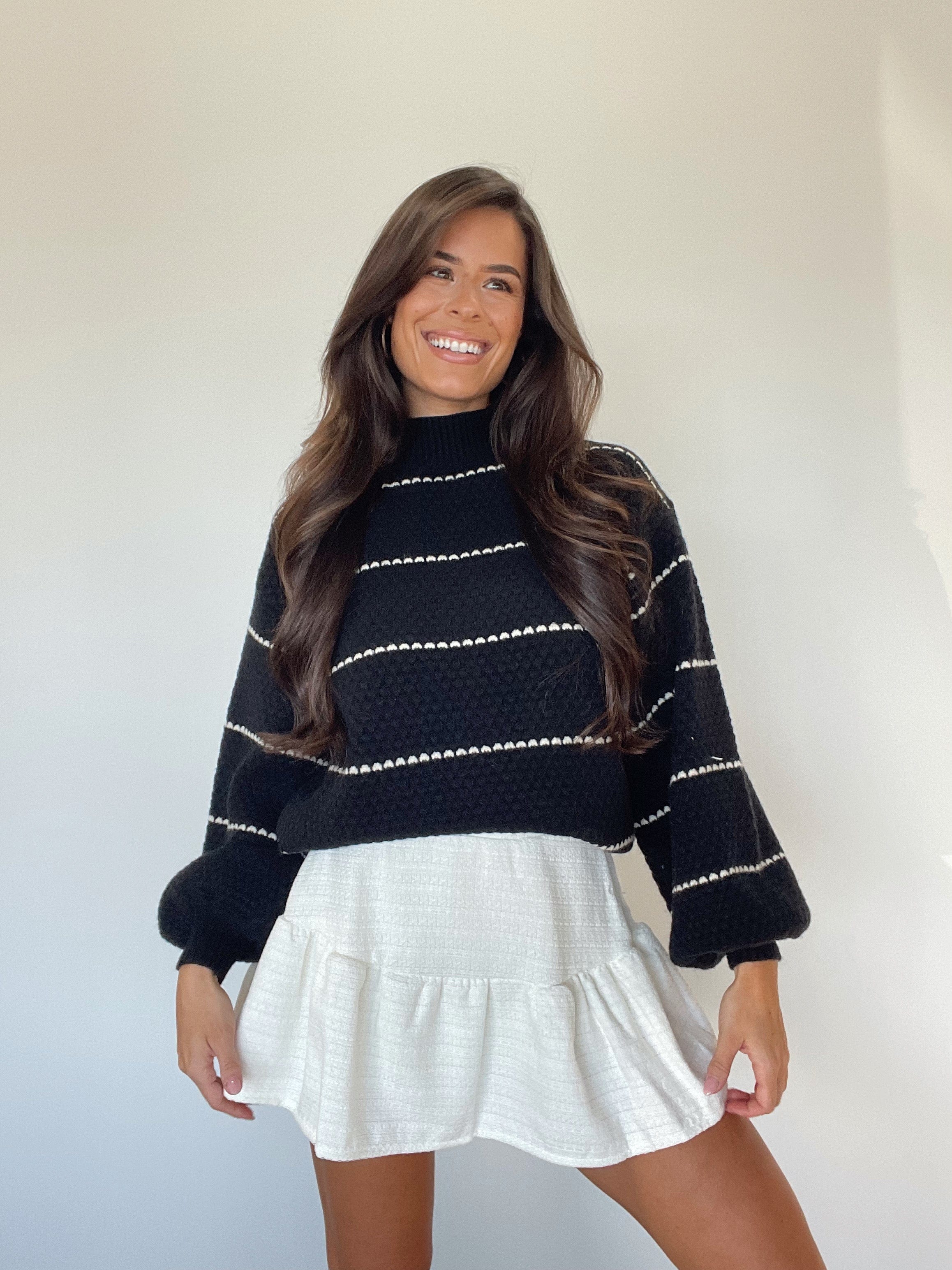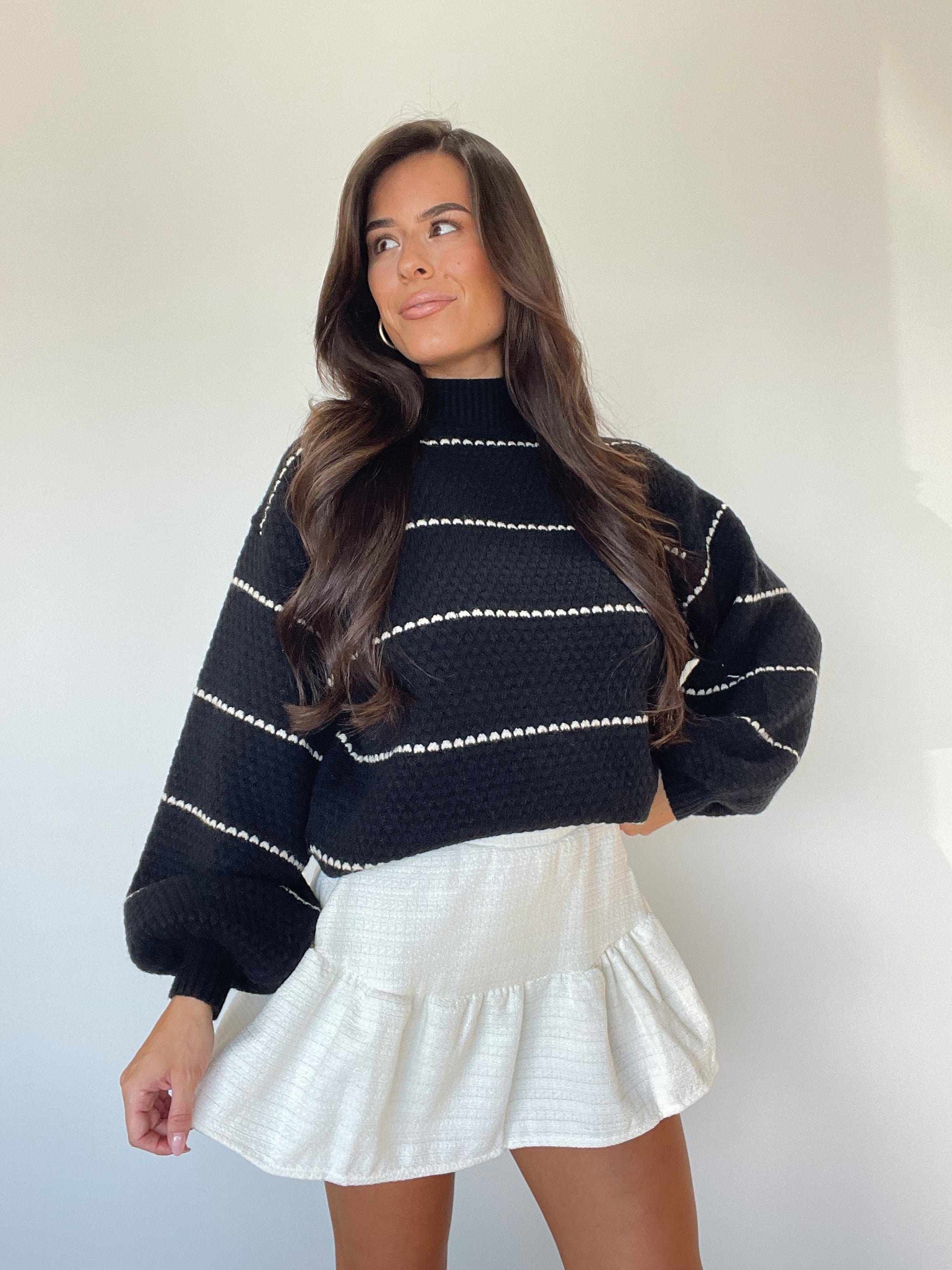 Expertly crafted for colder nights in the city, our City Nights Sweater is a must-have for any fashion-forward wardrobe. Made with a soft knit, this oversized sweater features a cozy turtleneck and long sleeves, perfect for staying warm and stylish. The striped design adds a touch of sophistication to any outfit.