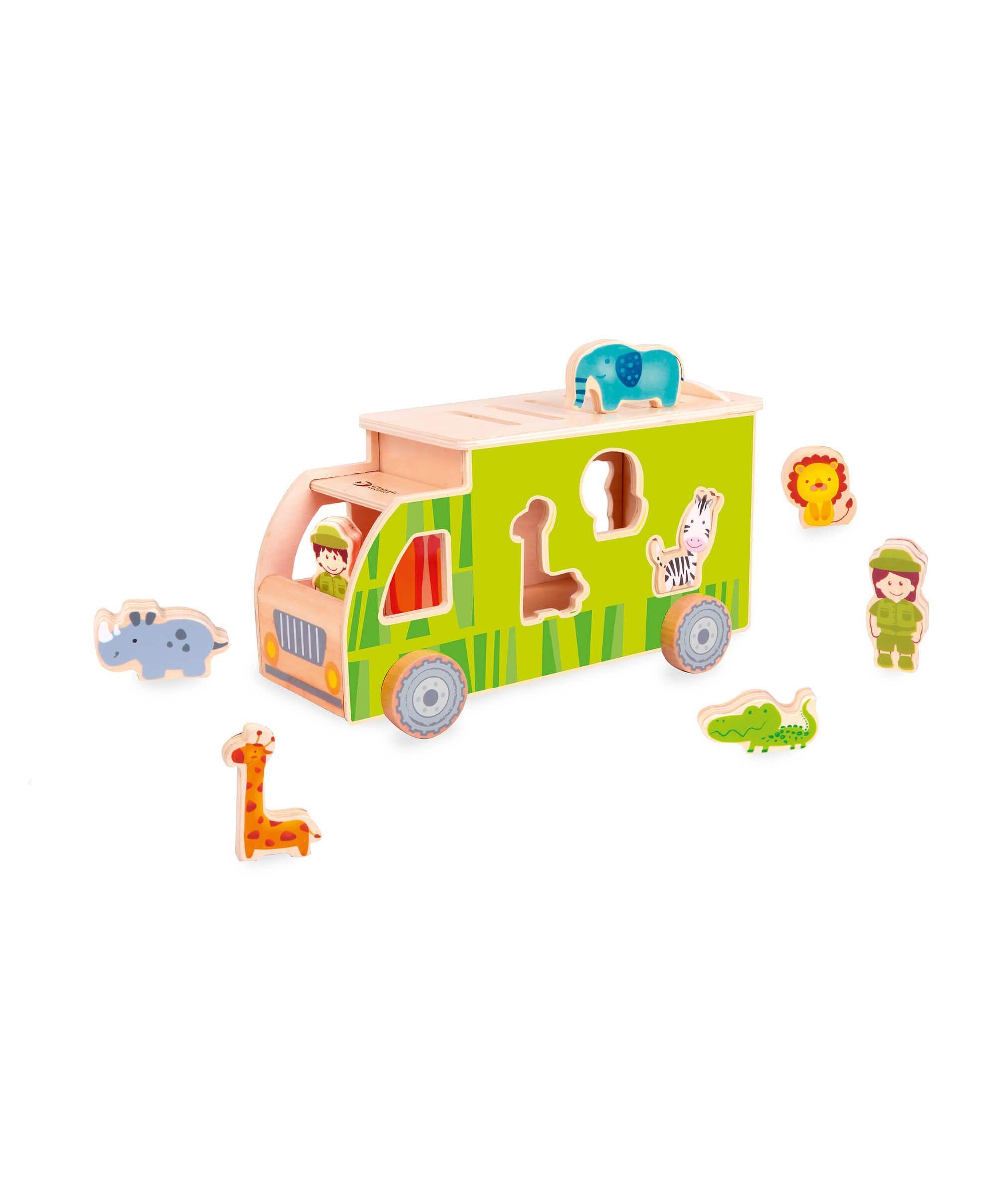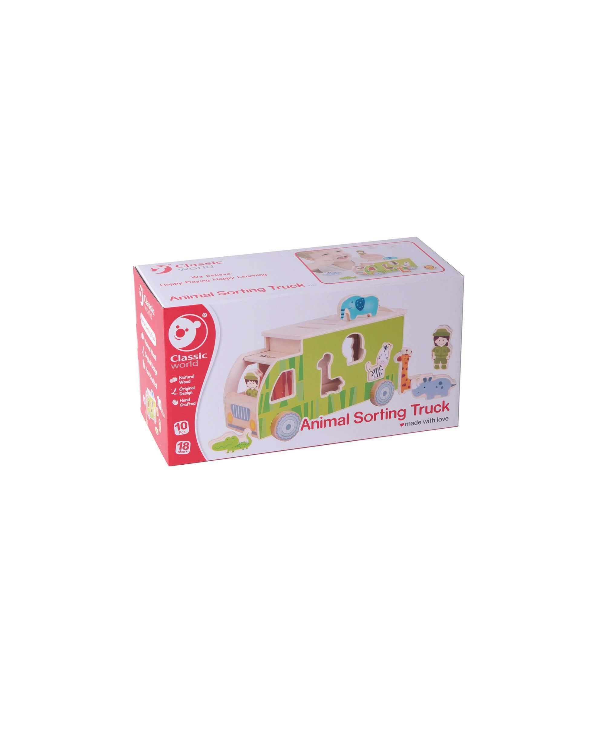 The animal truck wooden shape sorting toy is reminicient of traditional wooden toys, but this beautiful wooden toy has been designed to teach your little one all about the animal kingdom whilst also developing their spatial awareness and problem solving skills. The Animal Truck wooden shape sorting toy comes with 2 rescuers and 6 wild animals which can all be stored within the truck for safe keeping, to help keep your nursery clean whilst this Classic World toy isn't being used. Your little one can drive the truck around to pick up and sort the animals into their designated slots on the side of the van, sparking their imagination and creative thinking.