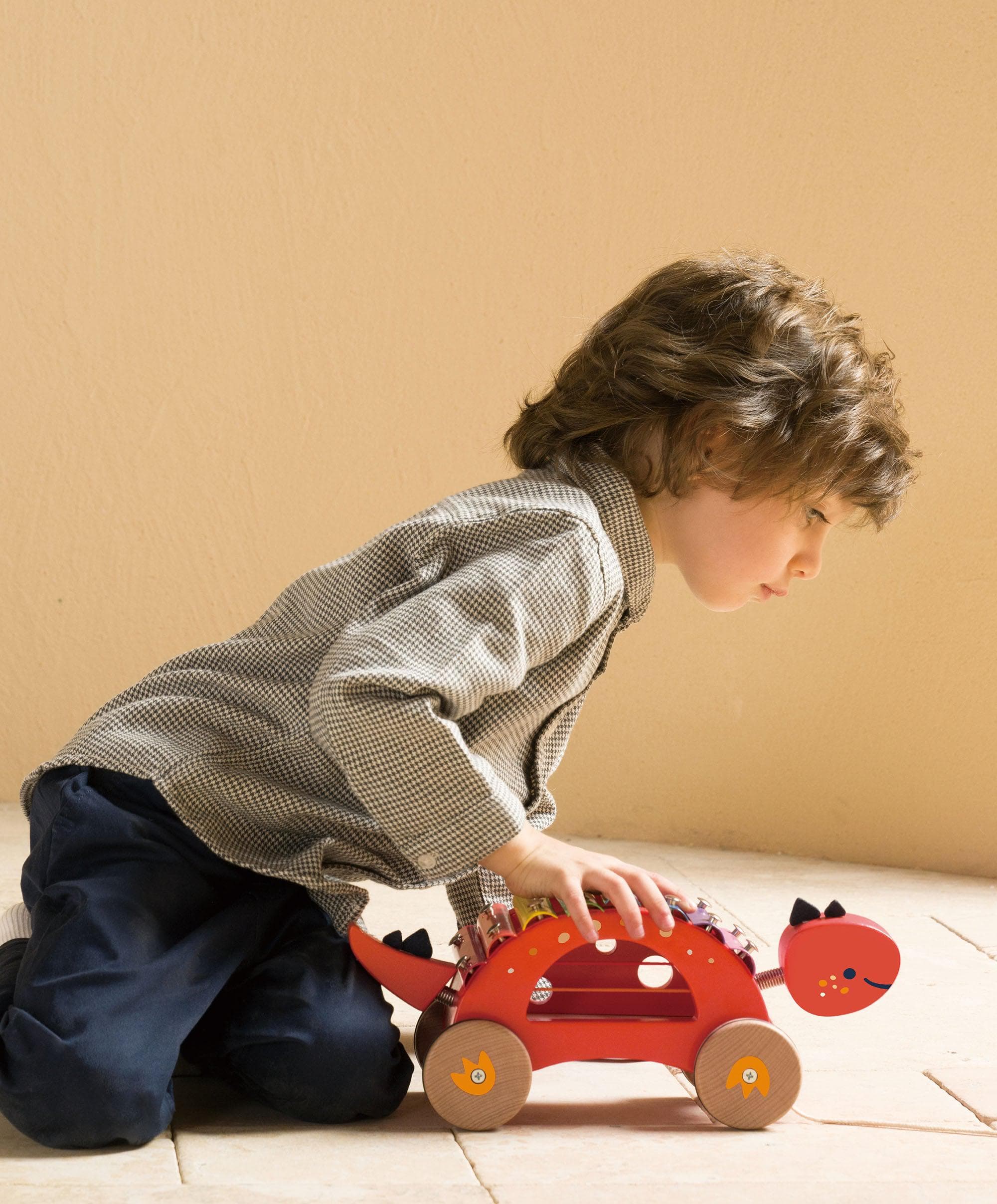 Make Walking more fun with this little cute dinosaur. Its neck and tail will wiggle with a rustle sound when pulled along. There is also a musical element to the toy as it has a xylophone on the top that can be played with.