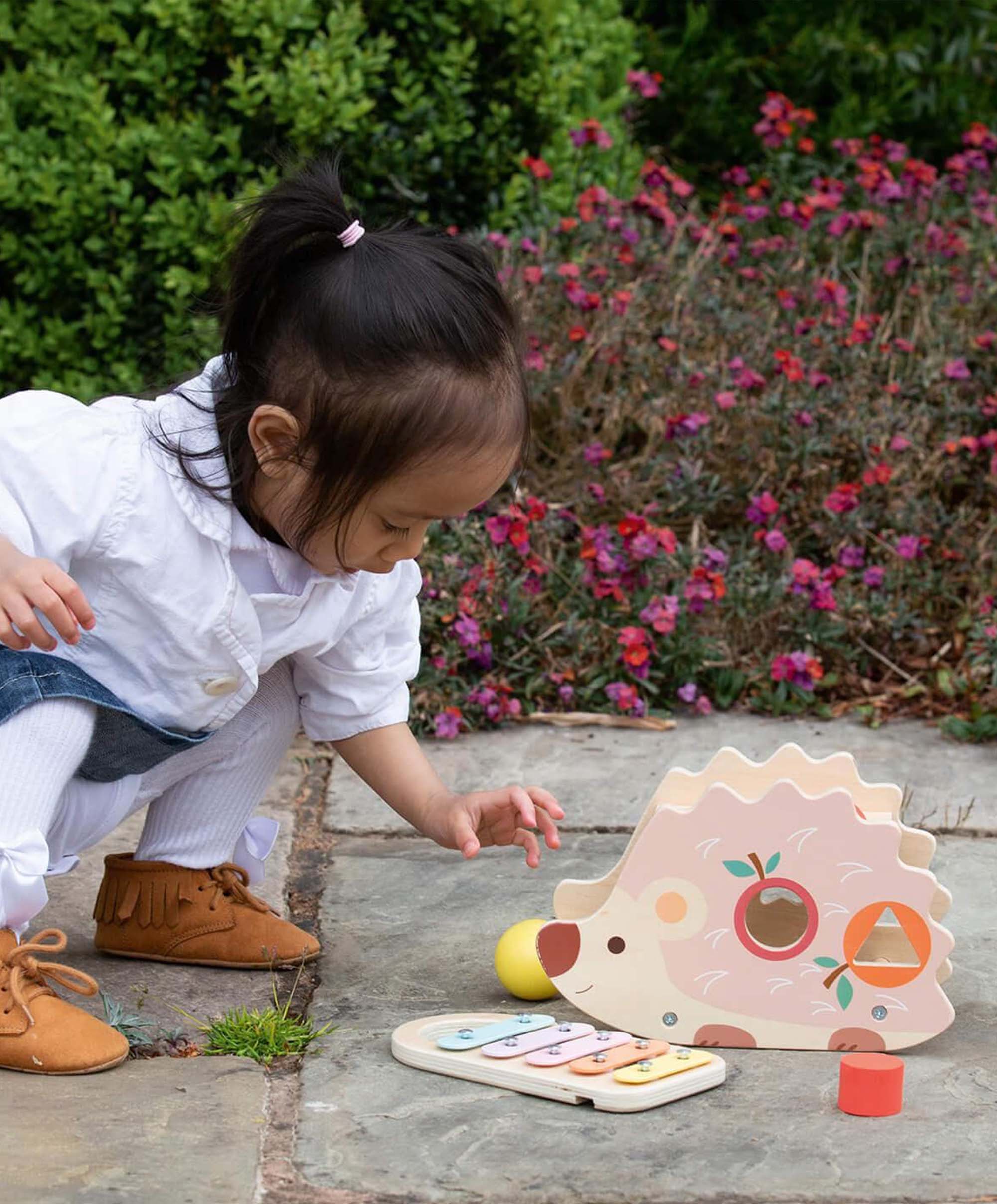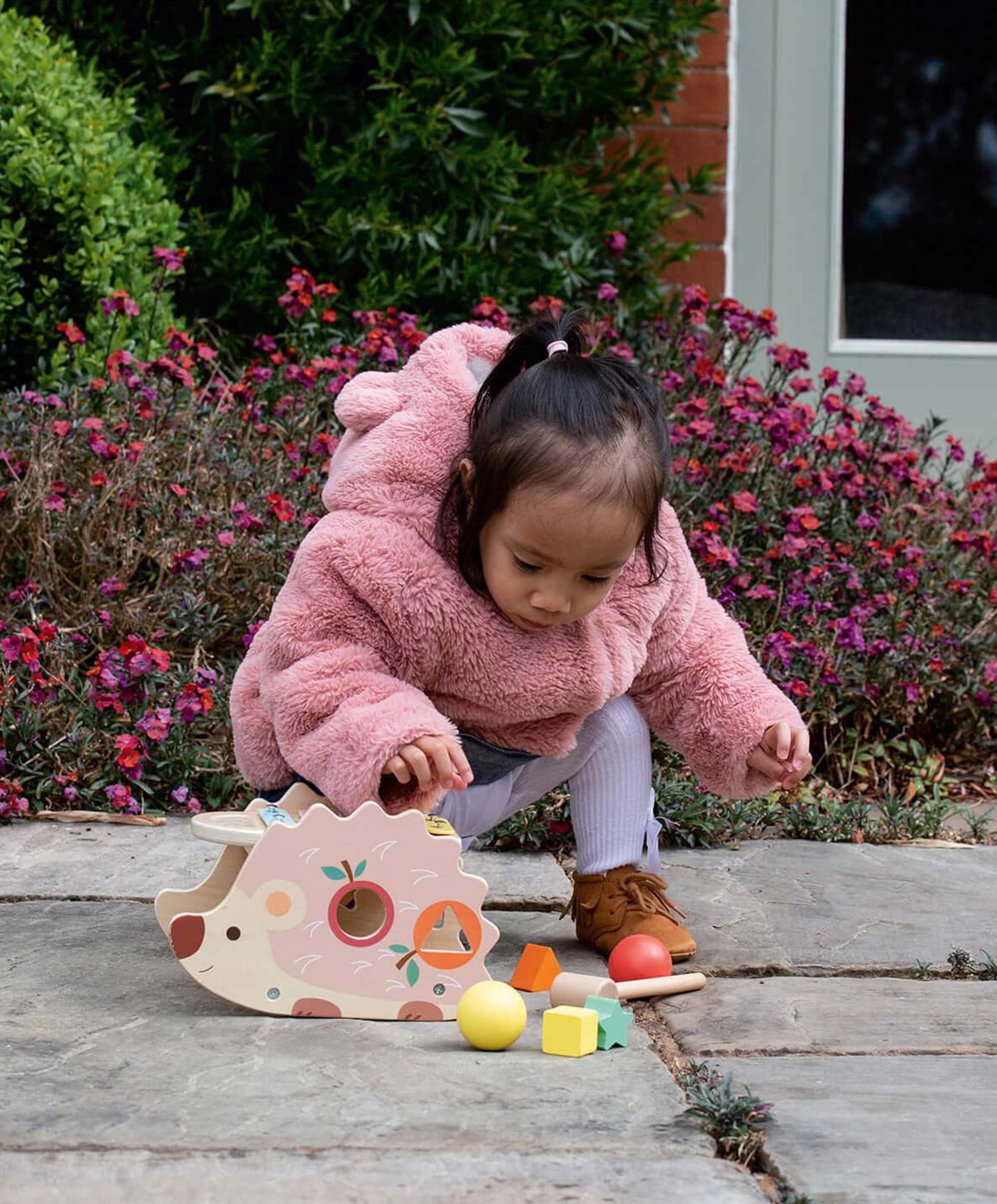 This charming little pink wooden hedgehog toy will provide hours of fun for your little one. The wooden balls can be hammered through the gaps and onto the xylophone to make unique noises, making this an adordable beautiful wooden musical toy. The xylophone can be detached and used just with the hammer for more purposeful sounds. The blocks can also be pushed through the specifically shaped holes in the hedgehog. All this makes for an engaging wooden hammer toy that will encourage fine motor skill development and provide hours of entertainment.