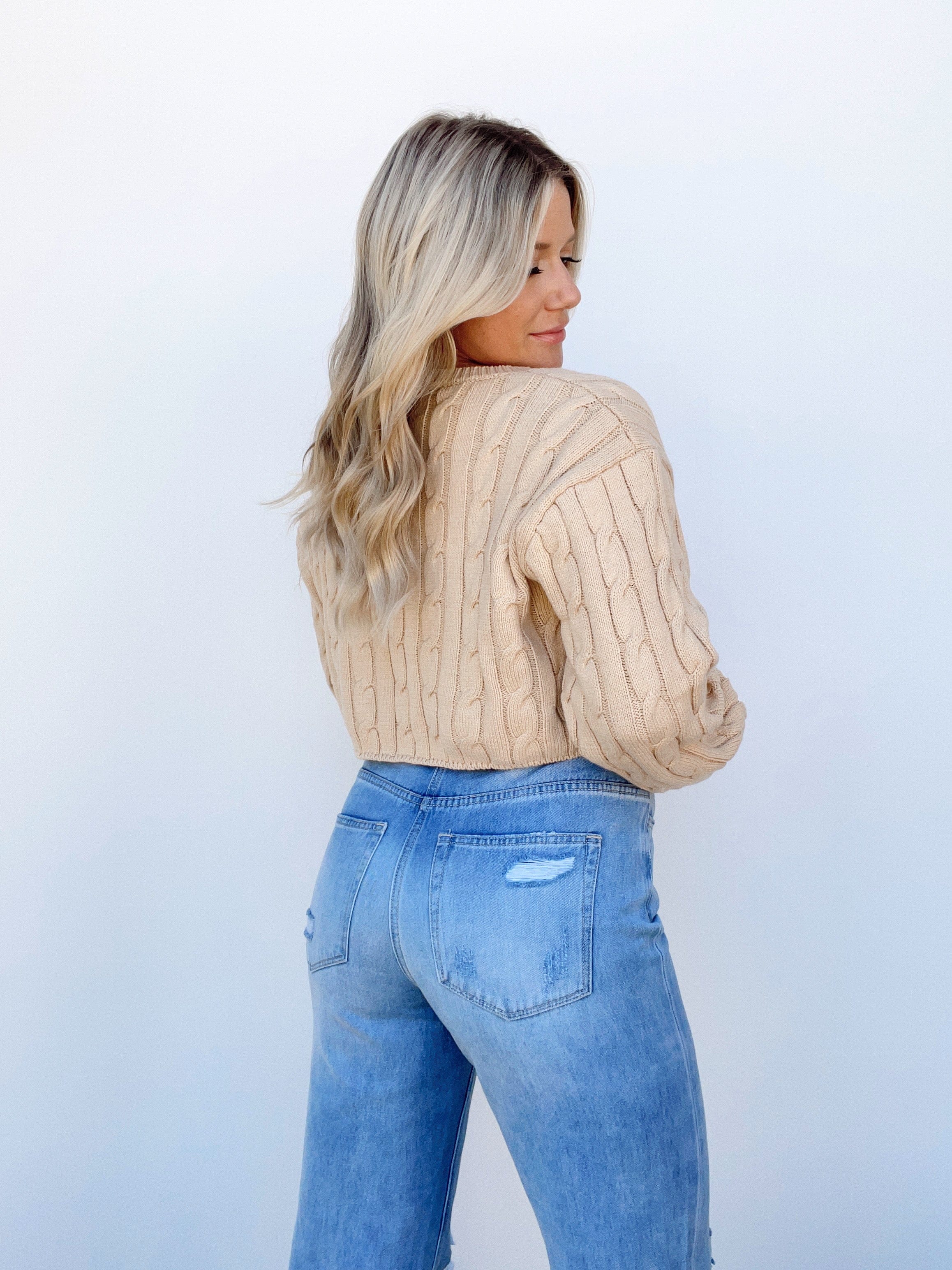 This Coffee Date Sweater is a luxurious staple for any wardrobe. Embodying chic comfort with its soft and stretchy cable knit construction, it features a cozy v-neckline and a cropped silhouette. The neutral shade makes it a versatile transition piece as you transition from fall to winter. Perfect for a casual yet elevated look.