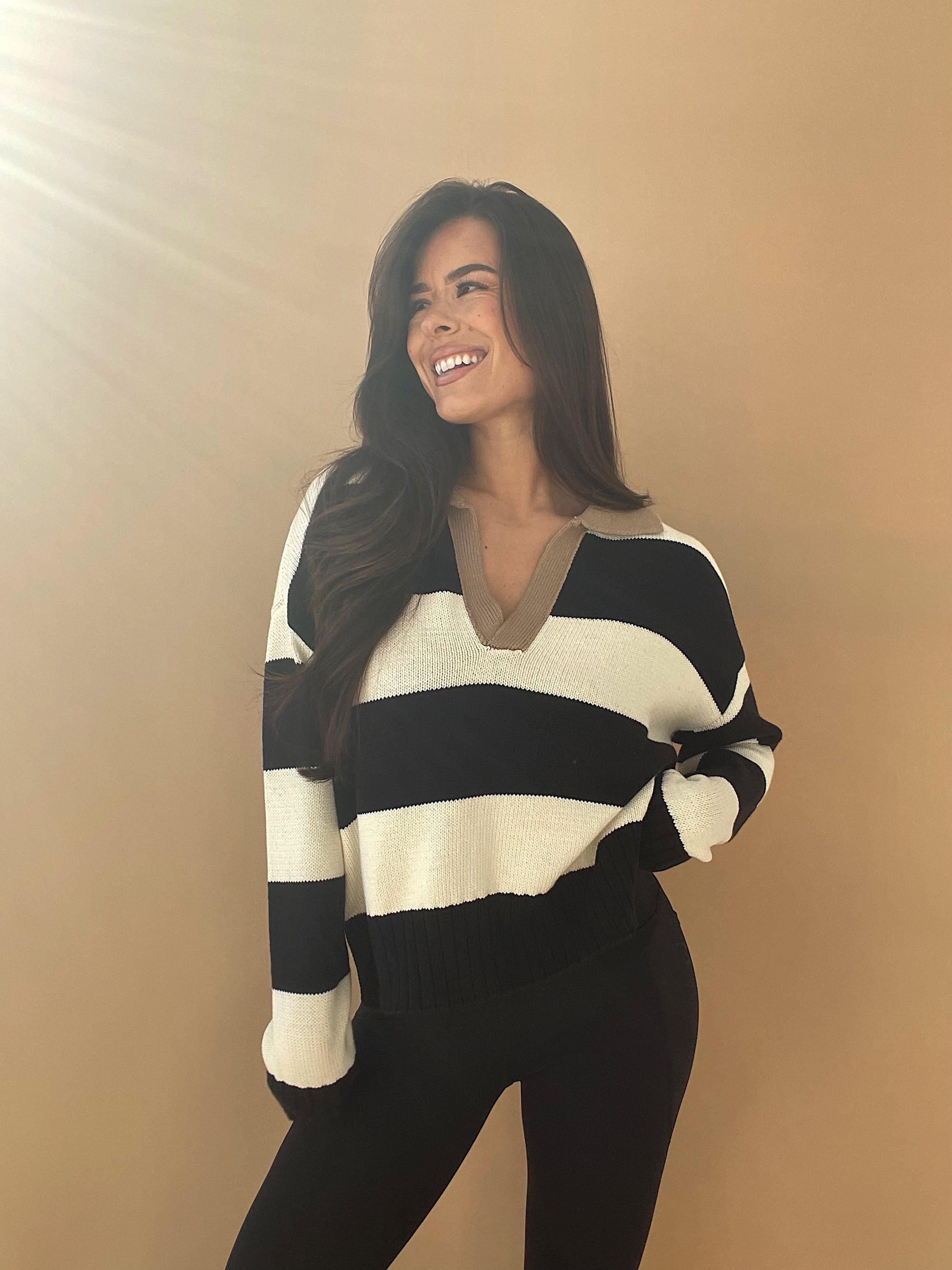 Expertly crafted with a contrast taupe collar and timeless striped design, the Collared Threads Sweater is the ultimate must-have for any wardrobe. With long sleeves to keep you warm and a cozy sweater knit, this versatile piece will elevate any outfit with its classic yet modern touch.