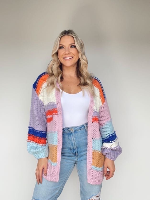 Elevate your wardrobe with this luxuriously soft Colorburst Cardigan. Featuring a vibrant striped knit, this open-front cardigan offers comfort and style for any special occasion or cozy day. Its relaxed fit, balloon sleeves, and chic pop of color provides the perfect balance of fun and sophistication. Ideal for brunch dates, shopping trips, and lounging.