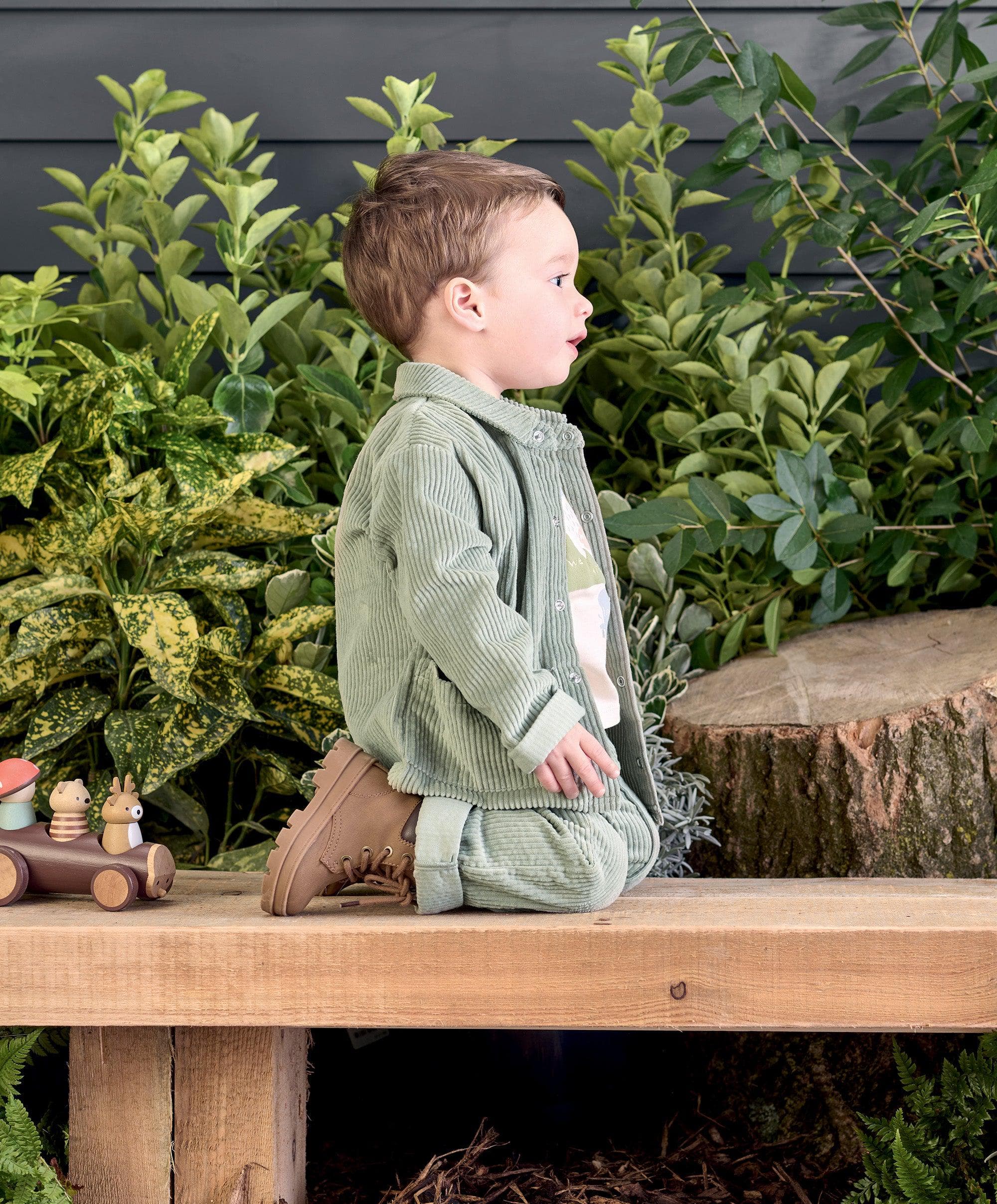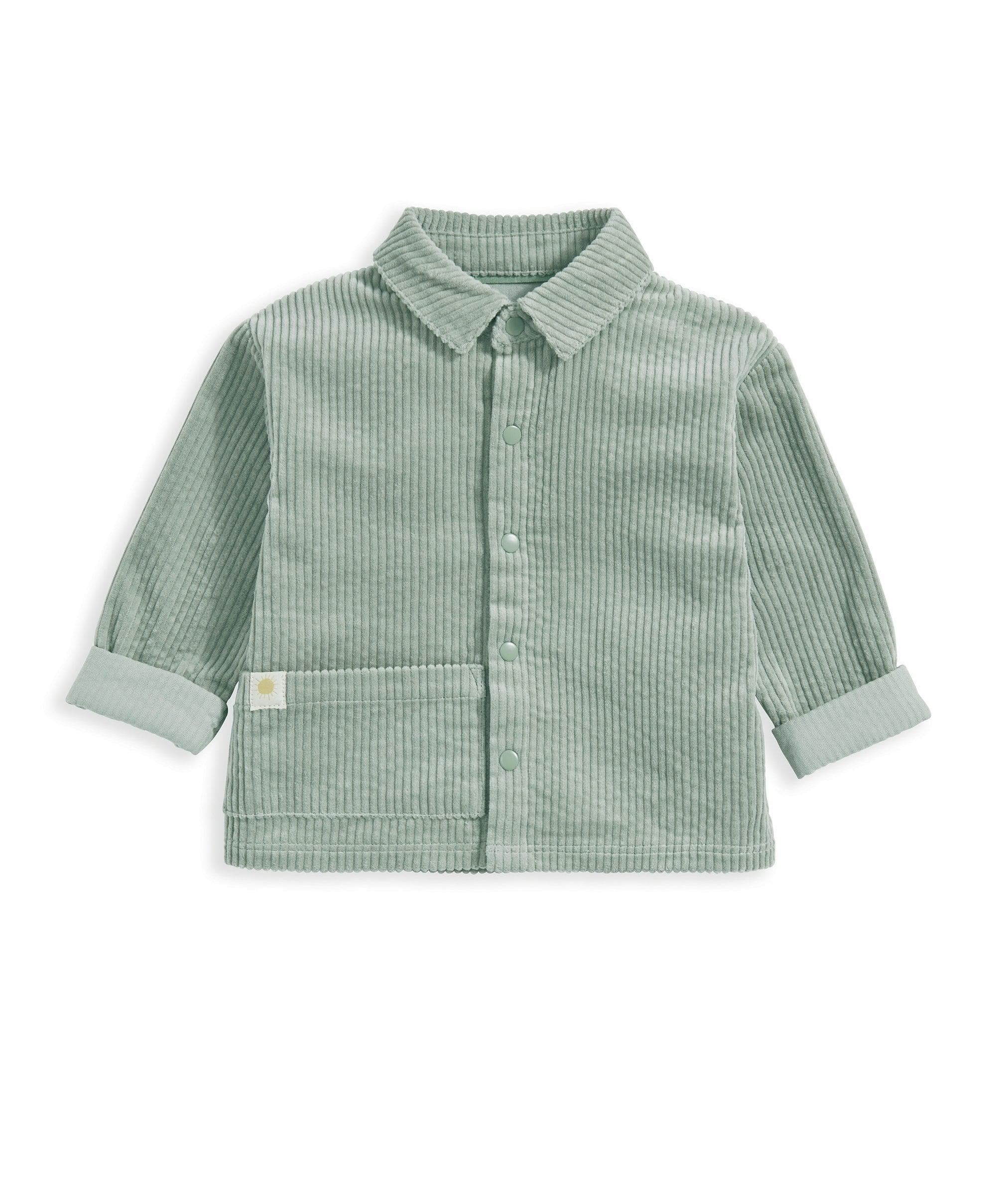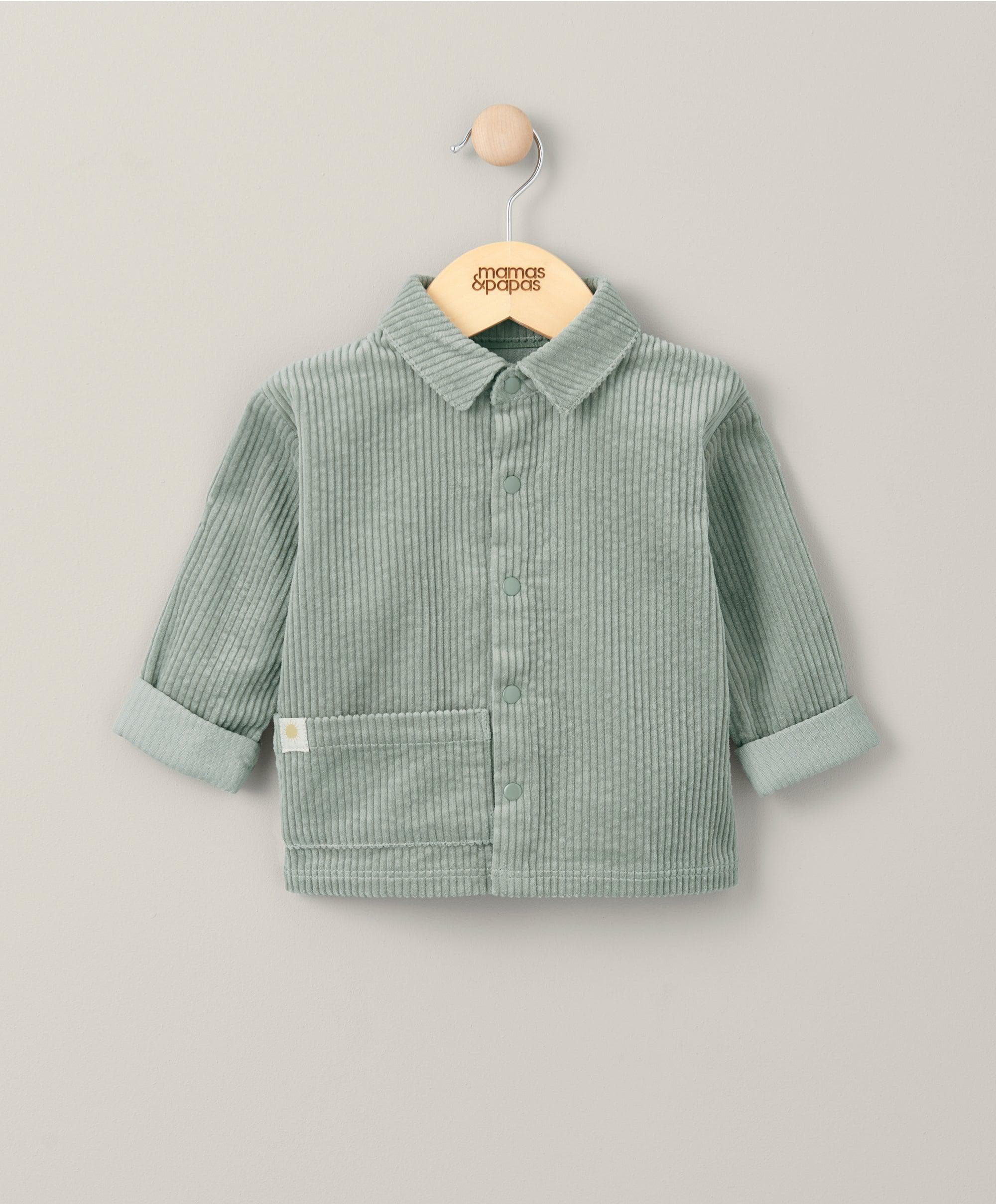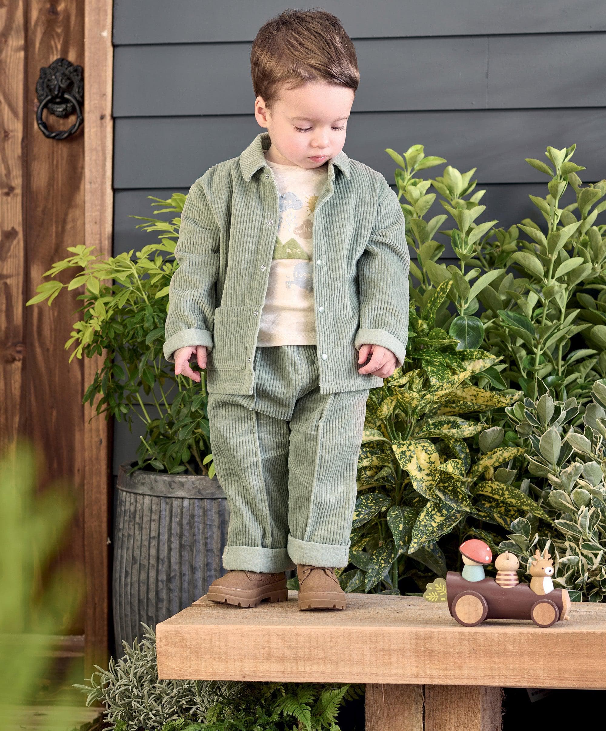 Boys' green cord jakcet with collar. In a stylish and comfy relaxed fit. Popper opening at front. Finished with pocket on front with badge detail. Pairs perfectly with our matching green cord trousers.