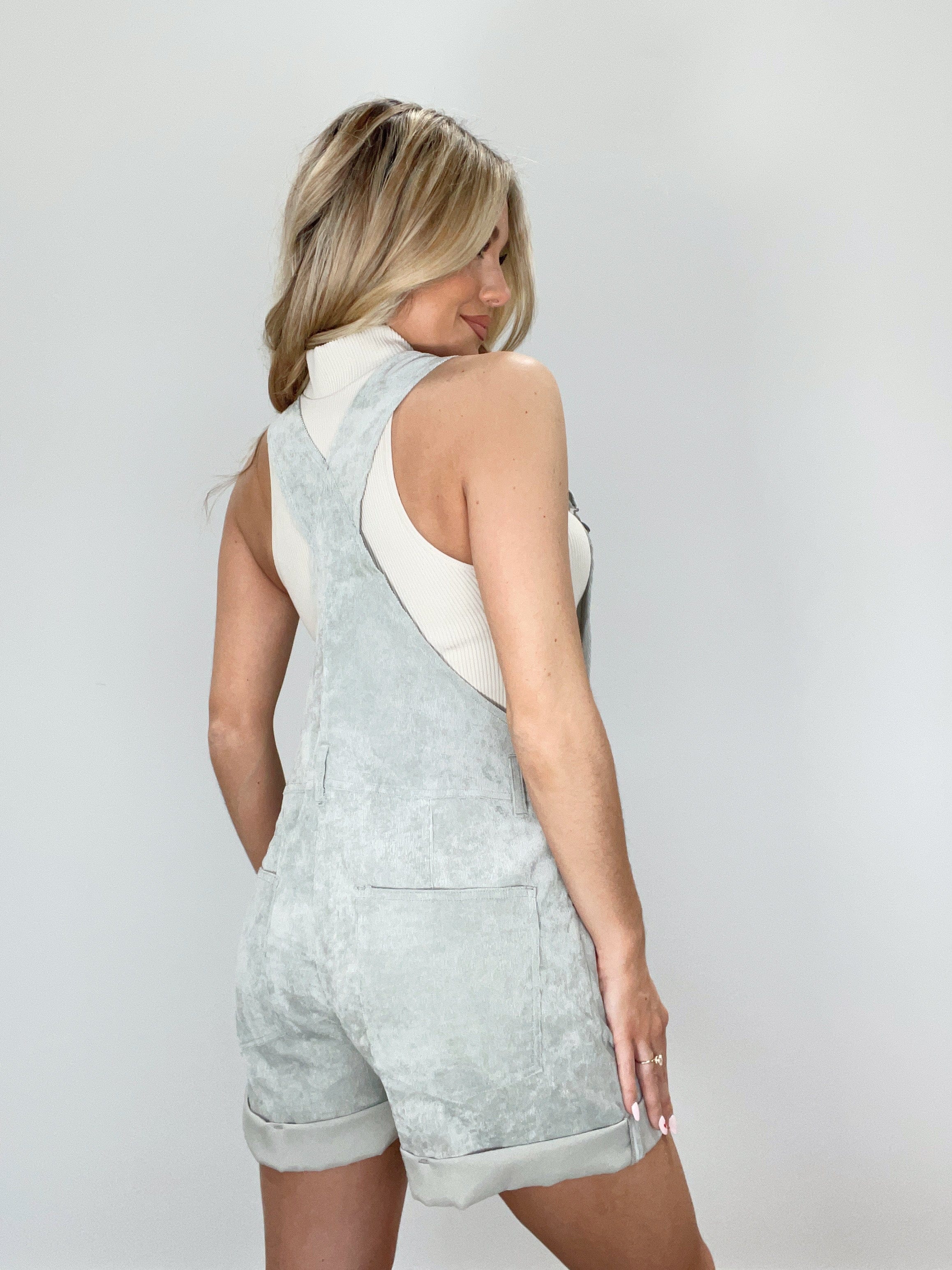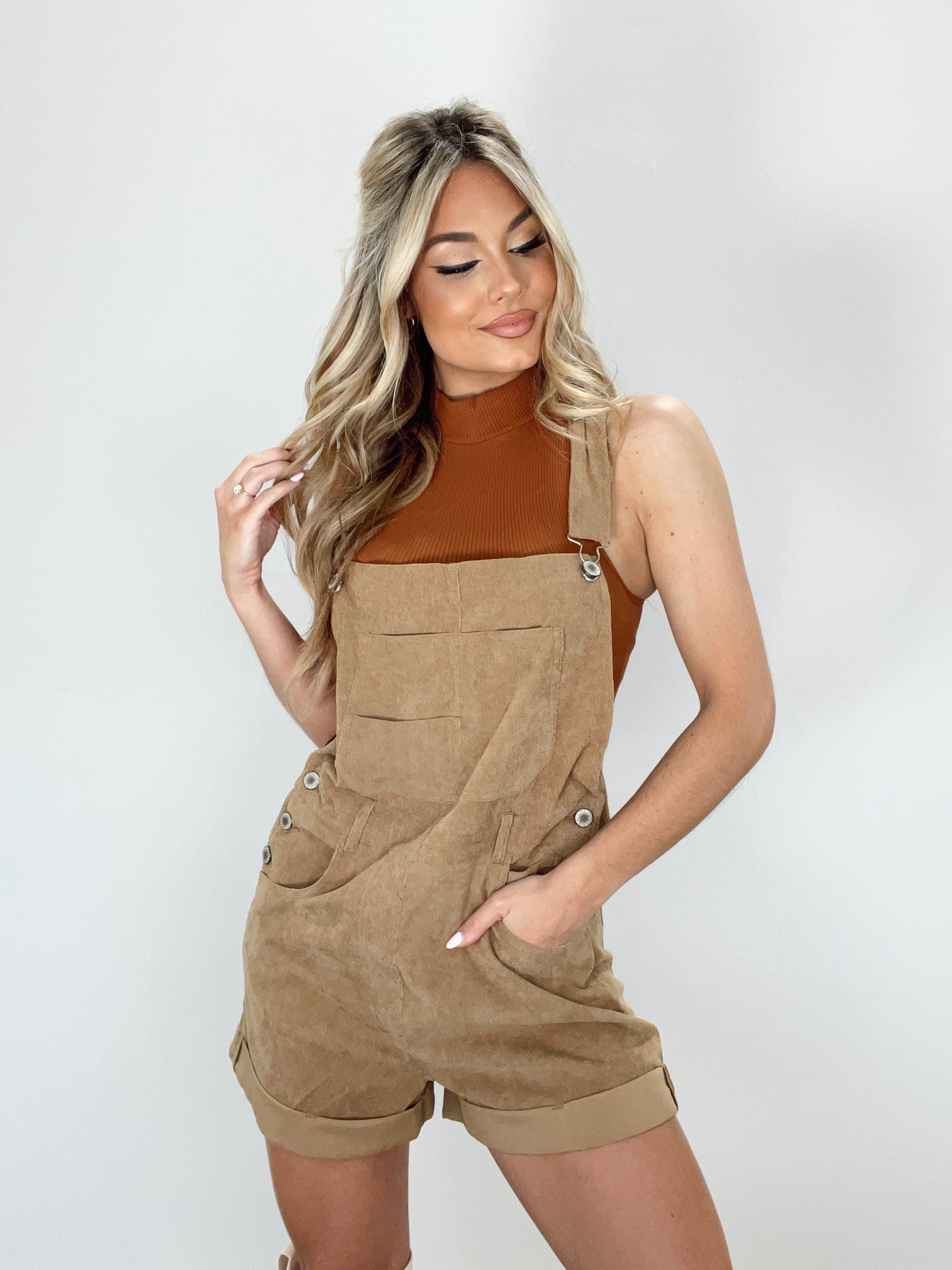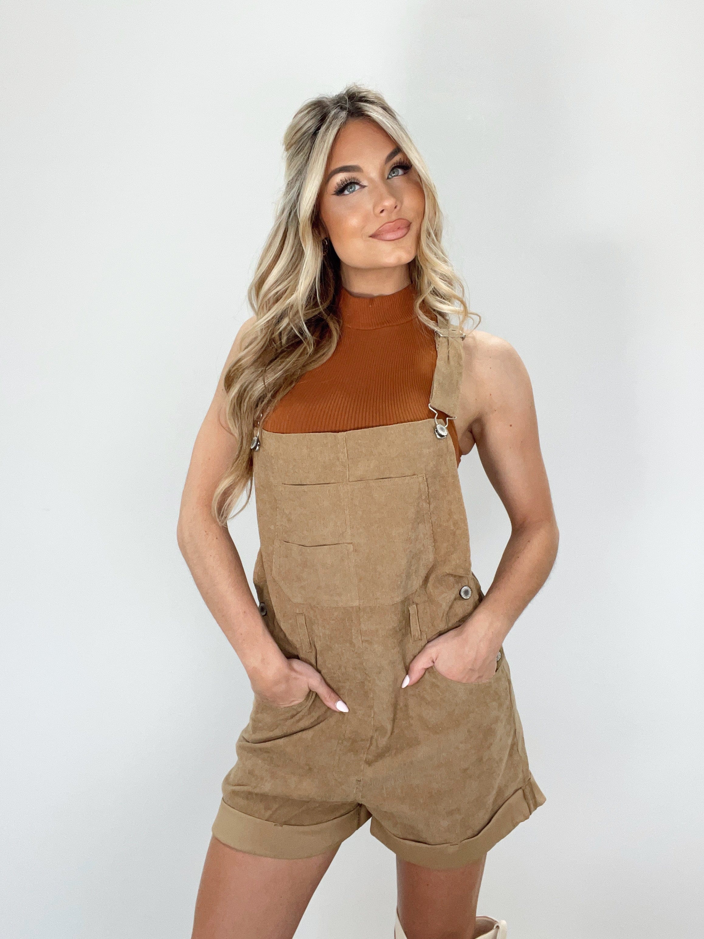 Experience sophisticated style with our luxurious Corduroy Shortalls. Crafted from soft and sumptuous corduroy, the classic square neckline and neatly folded hem exude refined elegance. Enjoy pocket details, adjustable straps, and subtle button closure details for all-day comfort and cosy transitions from summer to fall. Layer up and experience the perfect pumpkin patch to apple picking piece for an elevated and trendy look.
