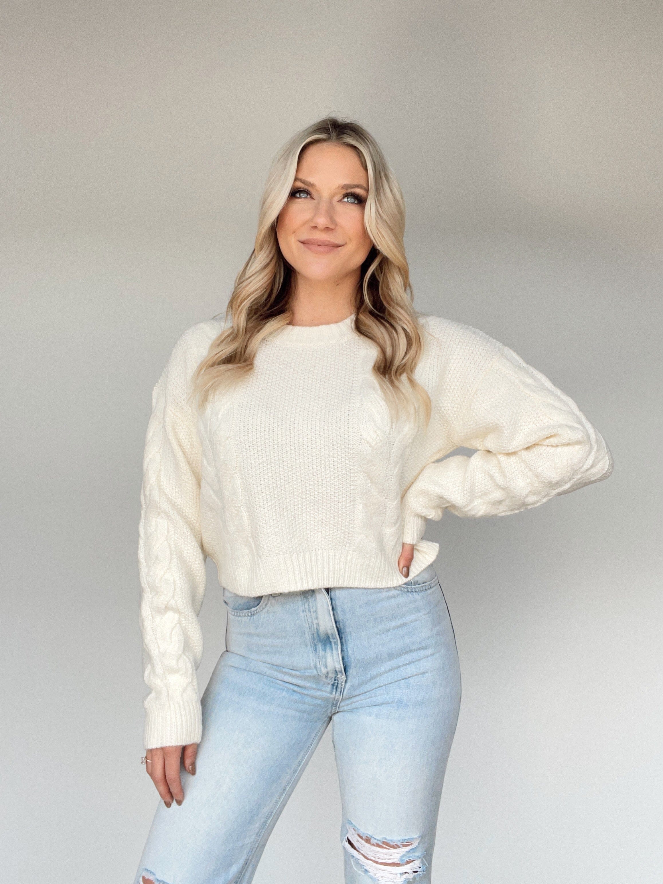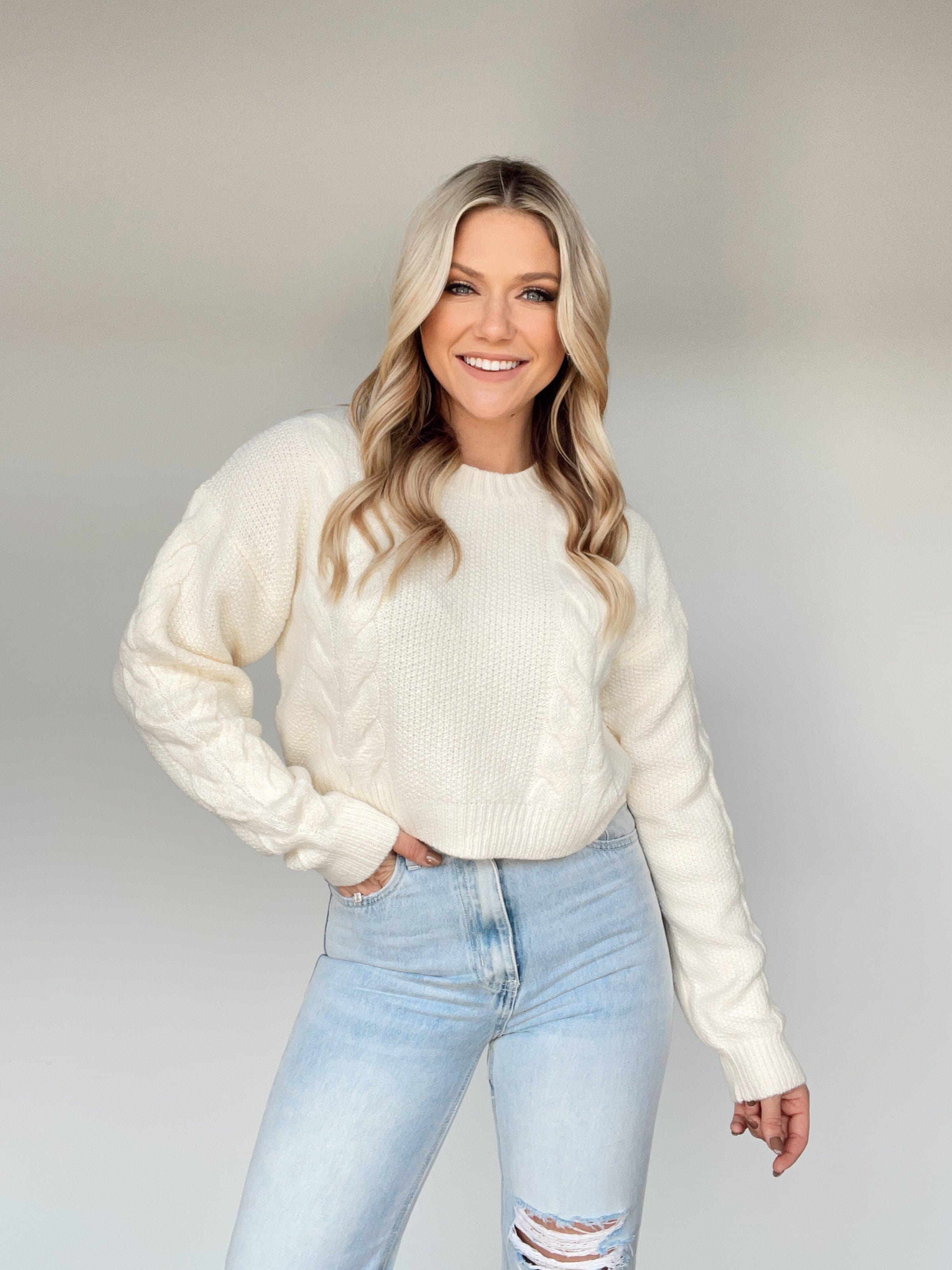 Treat yourself to an indulgence of ultimate comfort with the Cozy Charm Sweater. This classic and versatile staple features luxuriously soft fabric, a cable knit pattern, and a rounded neckline for a touch of sophistication. Its cropped style and stretchy material create a cozy fit, making it the perfect choice for adding a hint of chic to any brunch, dinner, or fall look.