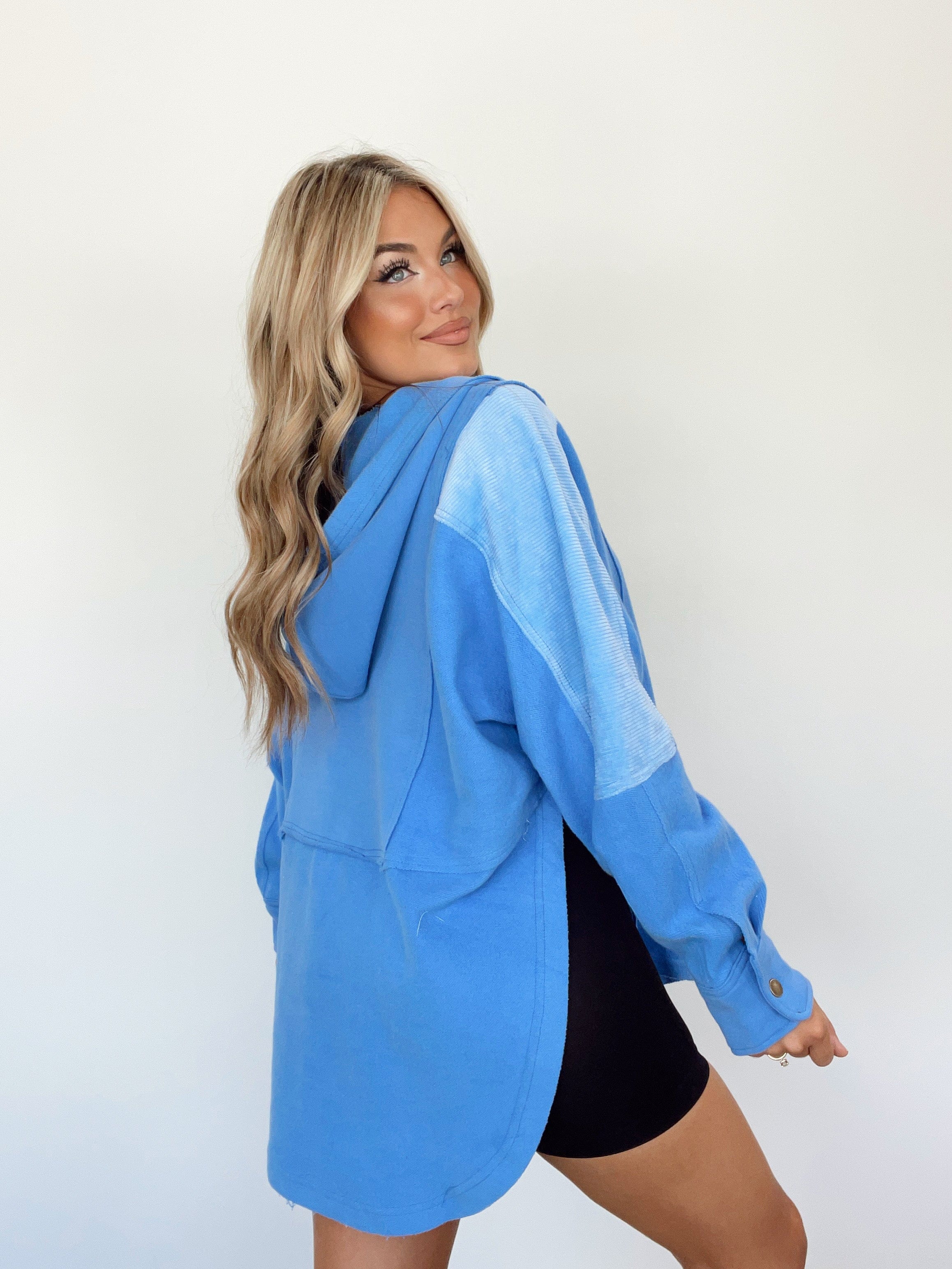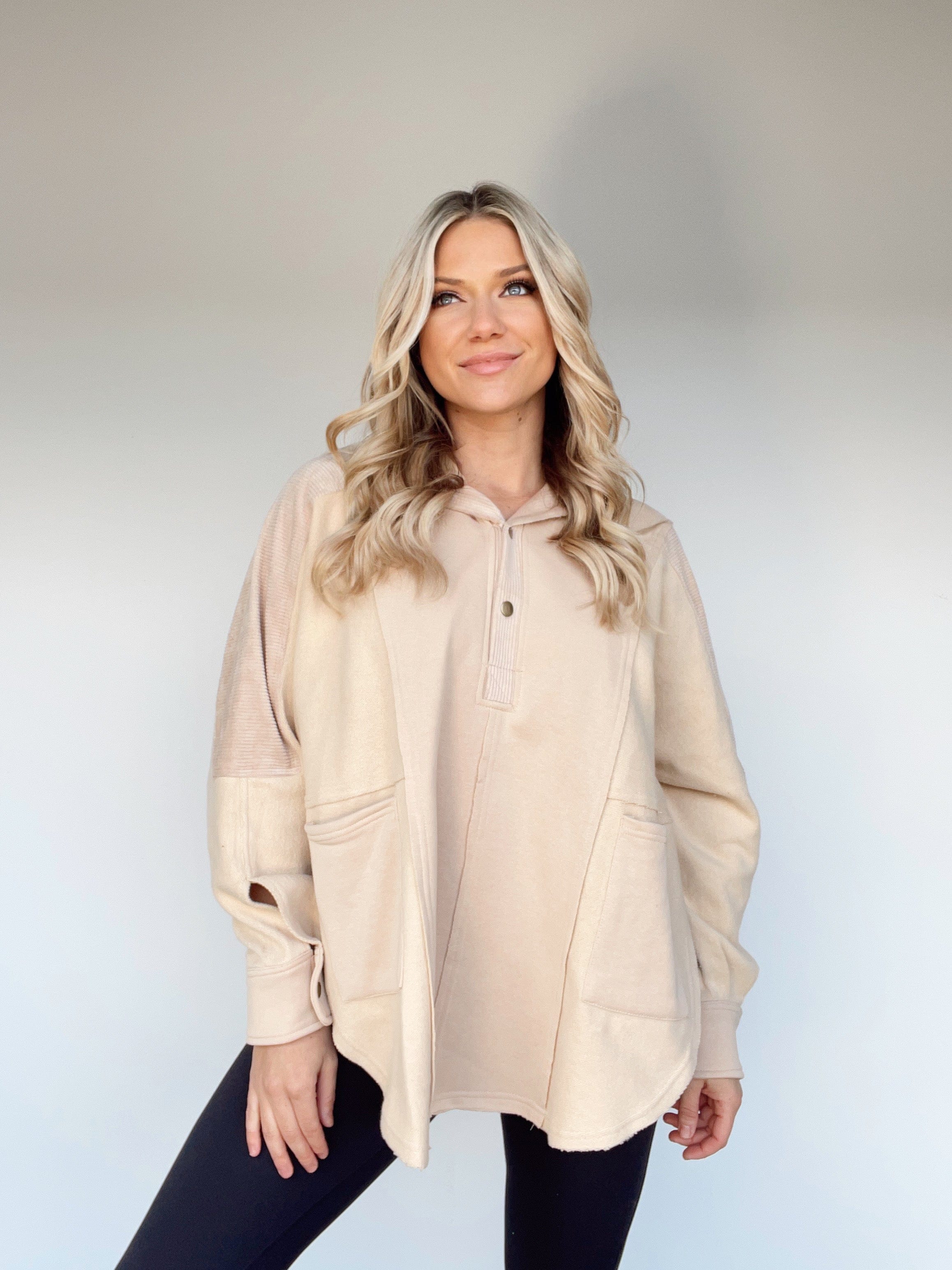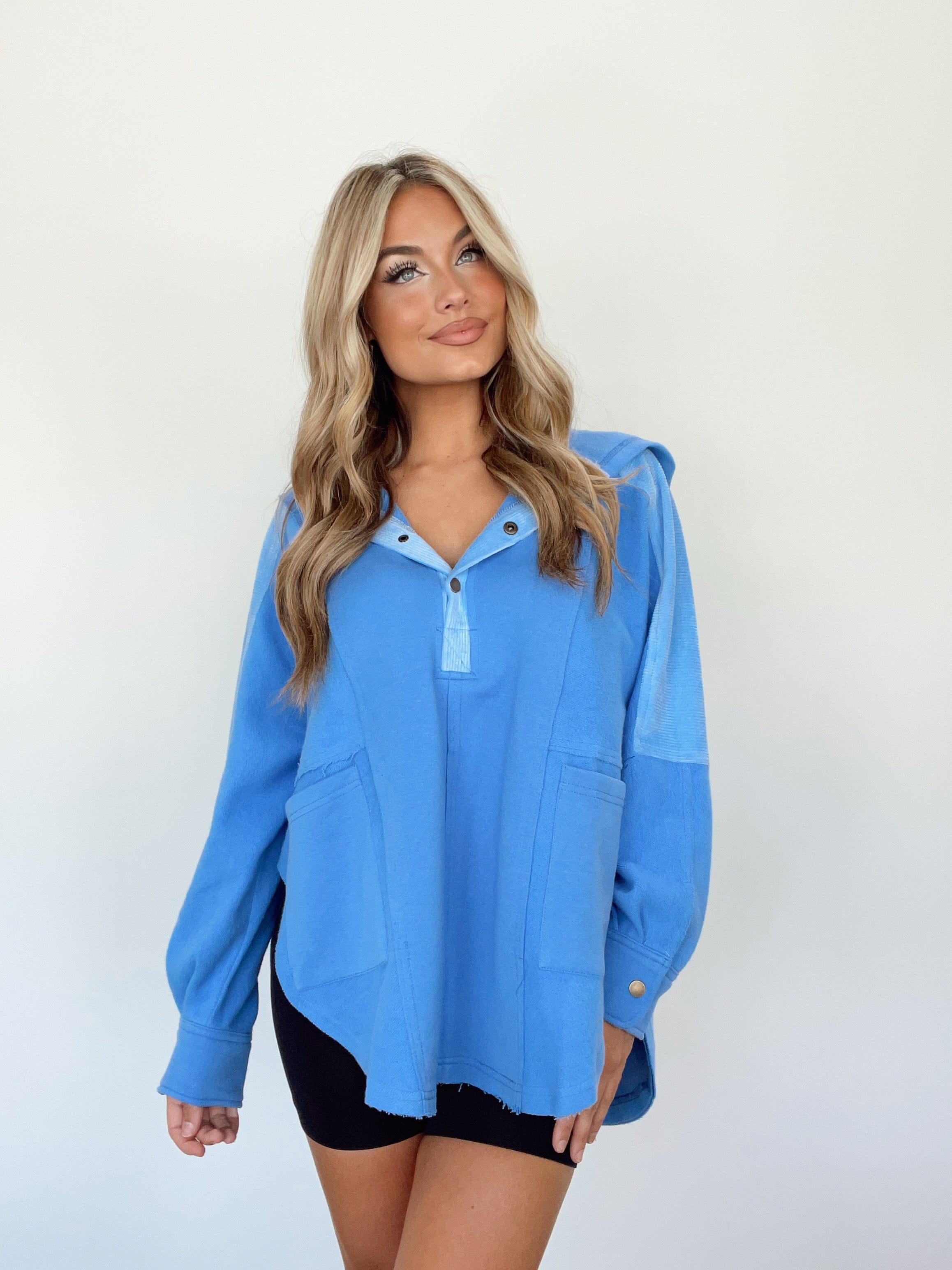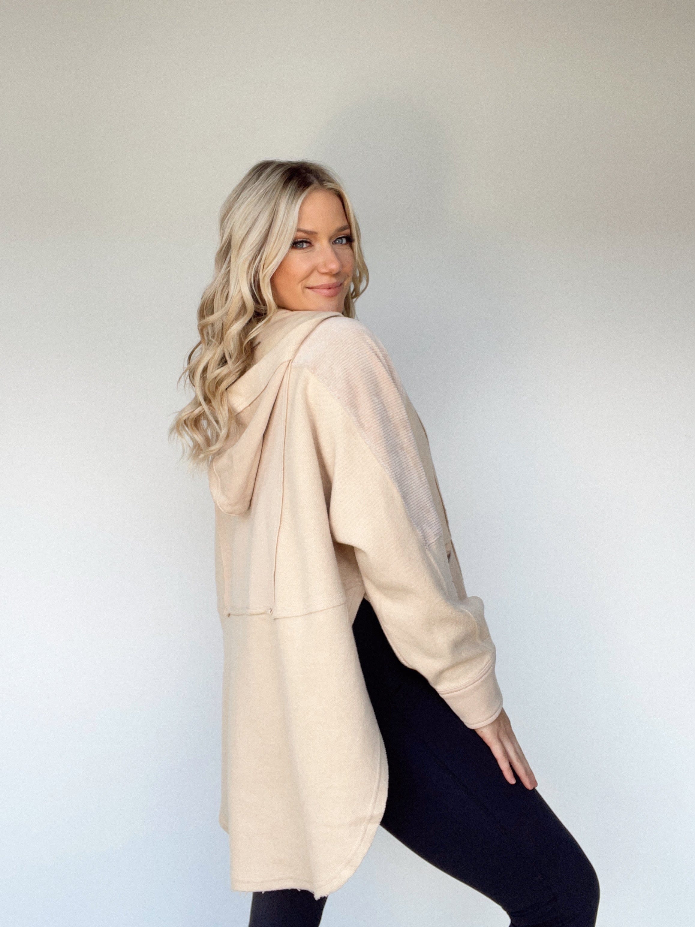 Dressed in soft corduroy and cotton, this Cozy Cord Henley is the perfect garment for errands and lounging alike. With a luxuriously relaxed oversize fit, attention to detail from the V neckline to the pocket details, corduroy paneling, and hood detail, this carefully-crafted piece radiates style and comfort. The button closures, rounded hem, and side opening details add a pop of color to your casual wardrobe.