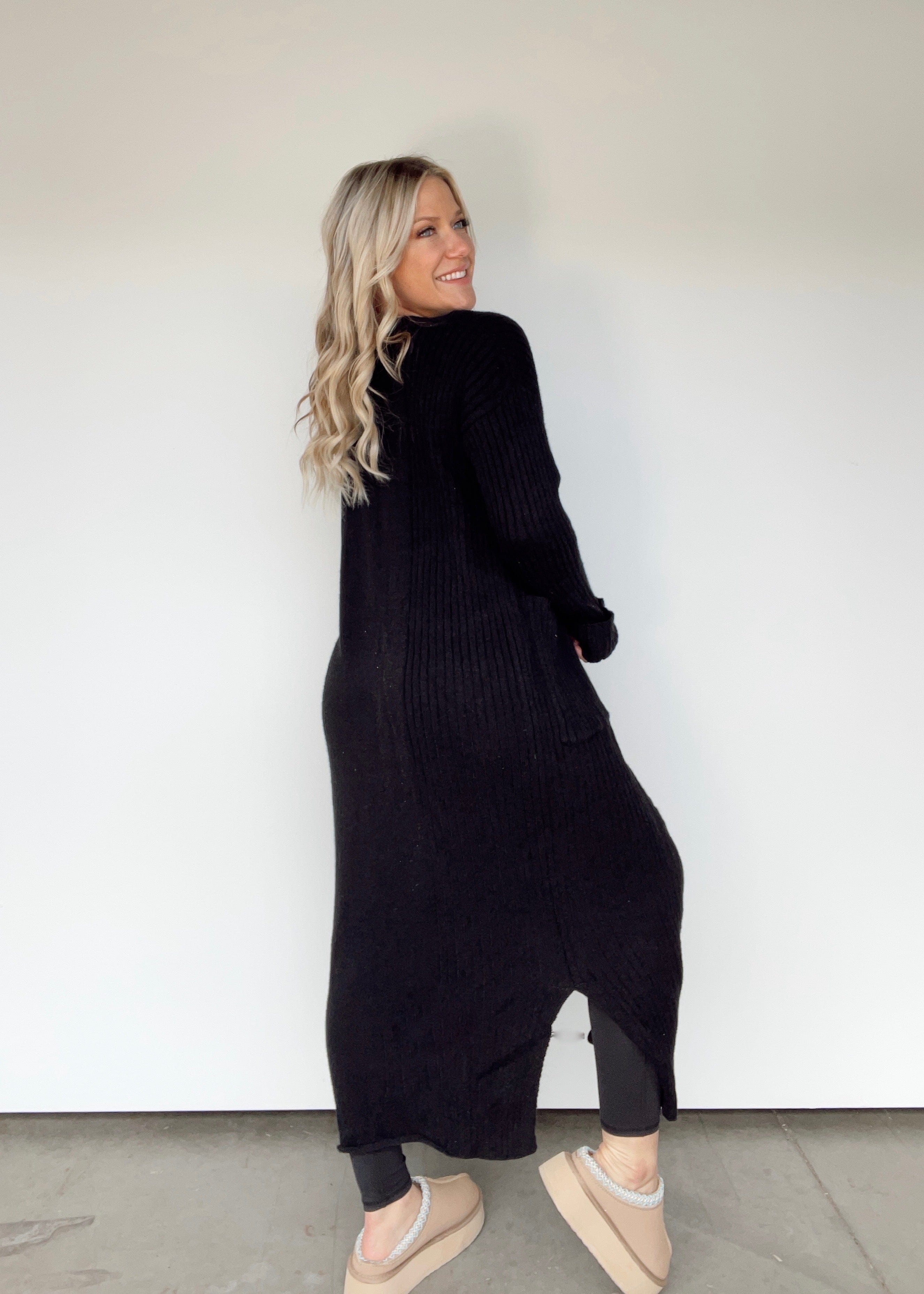 Wrap yourself in warmth and comfort with the Cozy Escape Cardigan. This ribbed-knit, ultra-soft piece is perfect for transitioning into cooler days while providing a touch of stretch for effortless lounging. It's an essential for fall, with its luxe pocket details, cozy warmth, long silhouette and neutral hue, plus side slit detail for added movement. Perfect for all activities, from running errands to pumpkin patch visits to brunching with the girls.