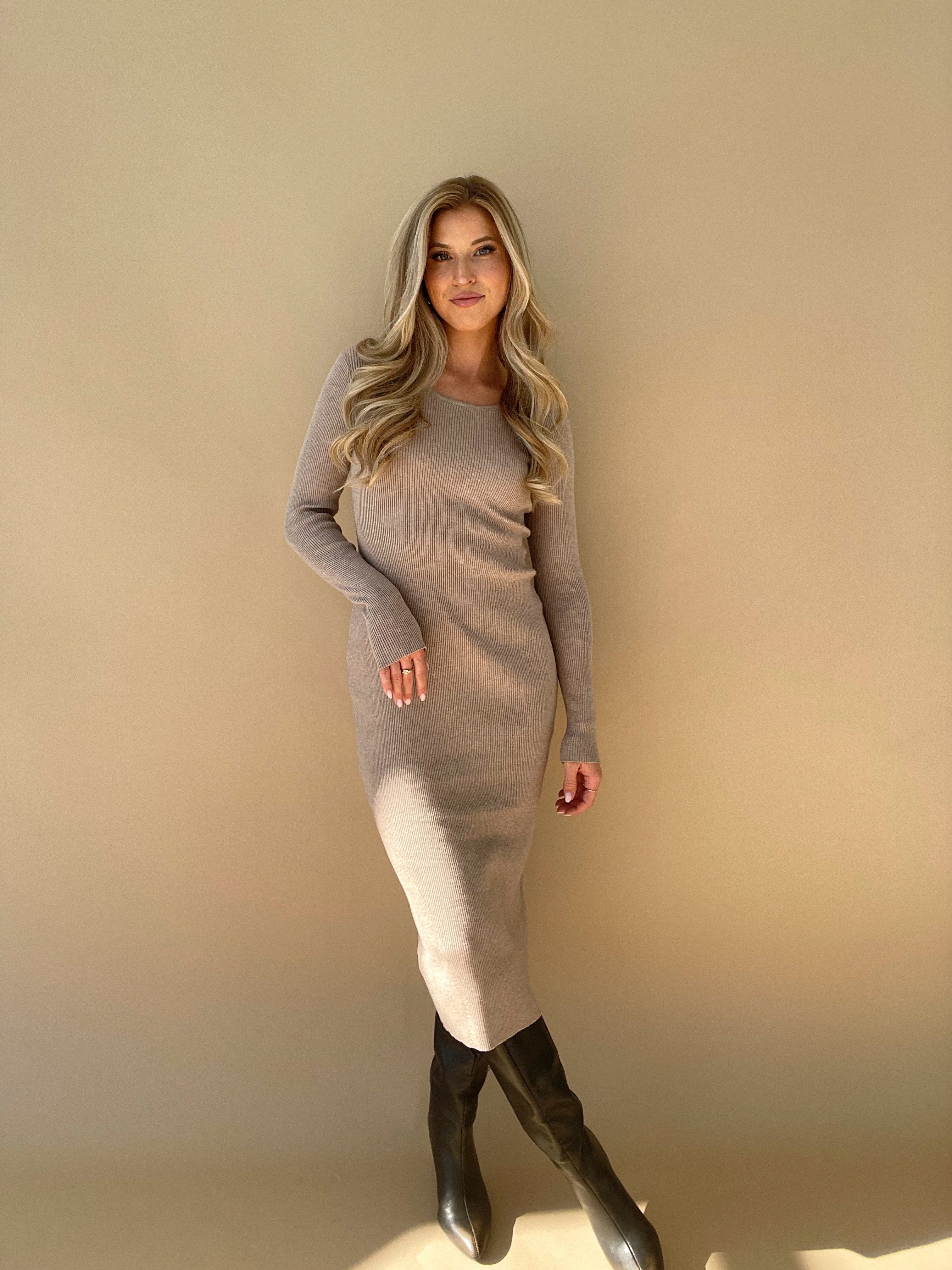 Effortlessly transition into fall with the Cozy Feels Sweater Dress. This midi dress features a warm and comfortable sweater material, perfect for cooler weather. With long sleeves, it's a versatile piece that can be dressed up or down for any occasion. Stay cozy and stylish this season.