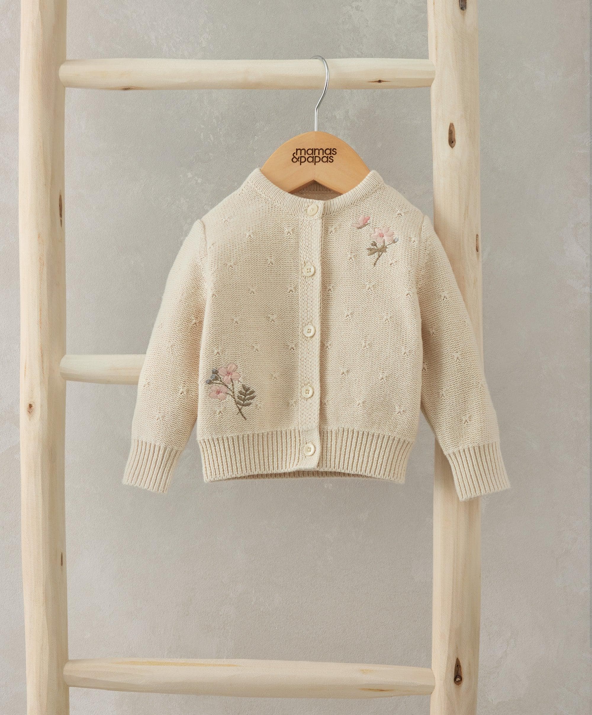 Girls' knitted long sleeve cream cardigan. With placement flower and butterfly embroidery and button fastening. Soft cosy knit fabric. Great for layering.