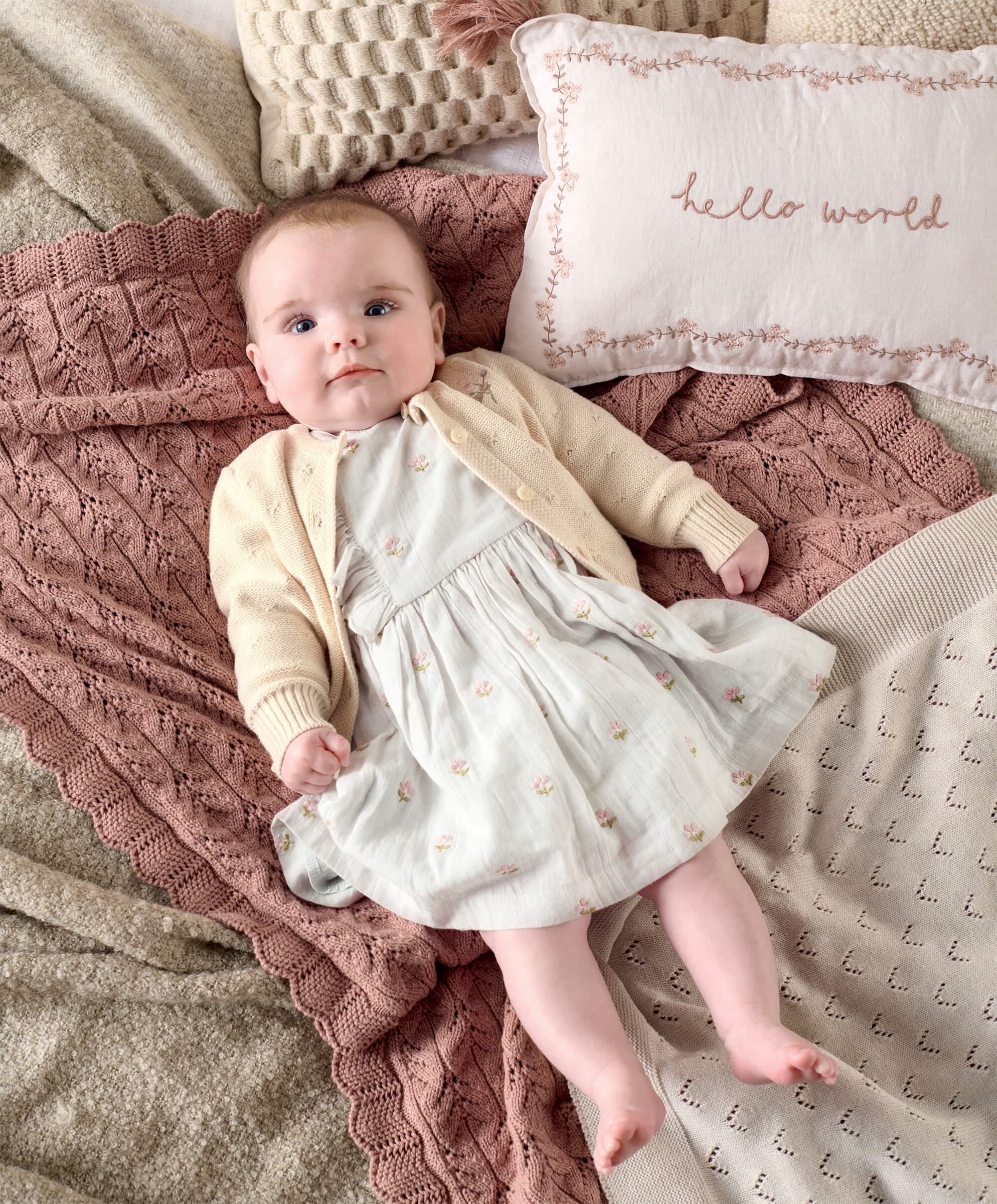 Inspired by dreams of slowing down, this new collection for newborns will breathe calm into their wardrobe. Hues are plucked from nature – dusty cornflower and muted tea rose; textures are abundant; and finer details such as scalloped trims and pointelle knits give a nod to heritage crafts. Make no mistake though, this is a modern collection full of inspired pieces.