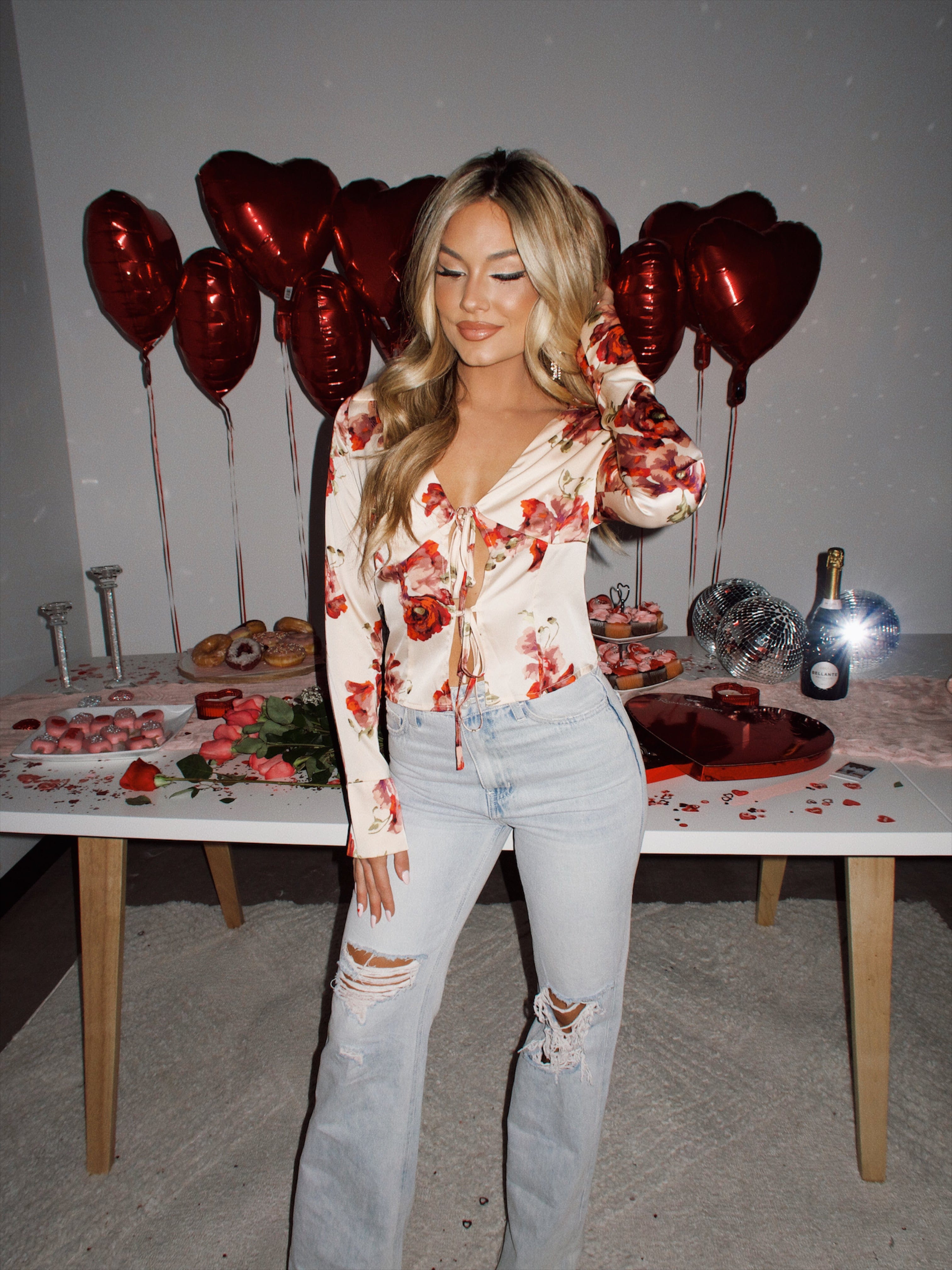 Elevate your evening look with our Cream Endless Roses Top. This sophisticated and classy top features a collared neckline and v neckline, giving it an elevated and sleek feel. The front tie details and cropped length add a trendy touch, perfect for a dinner or drinks outing. Made from luxurious satin, this long sleeve top is perfect for Valentine's Day or any sweet occasion.