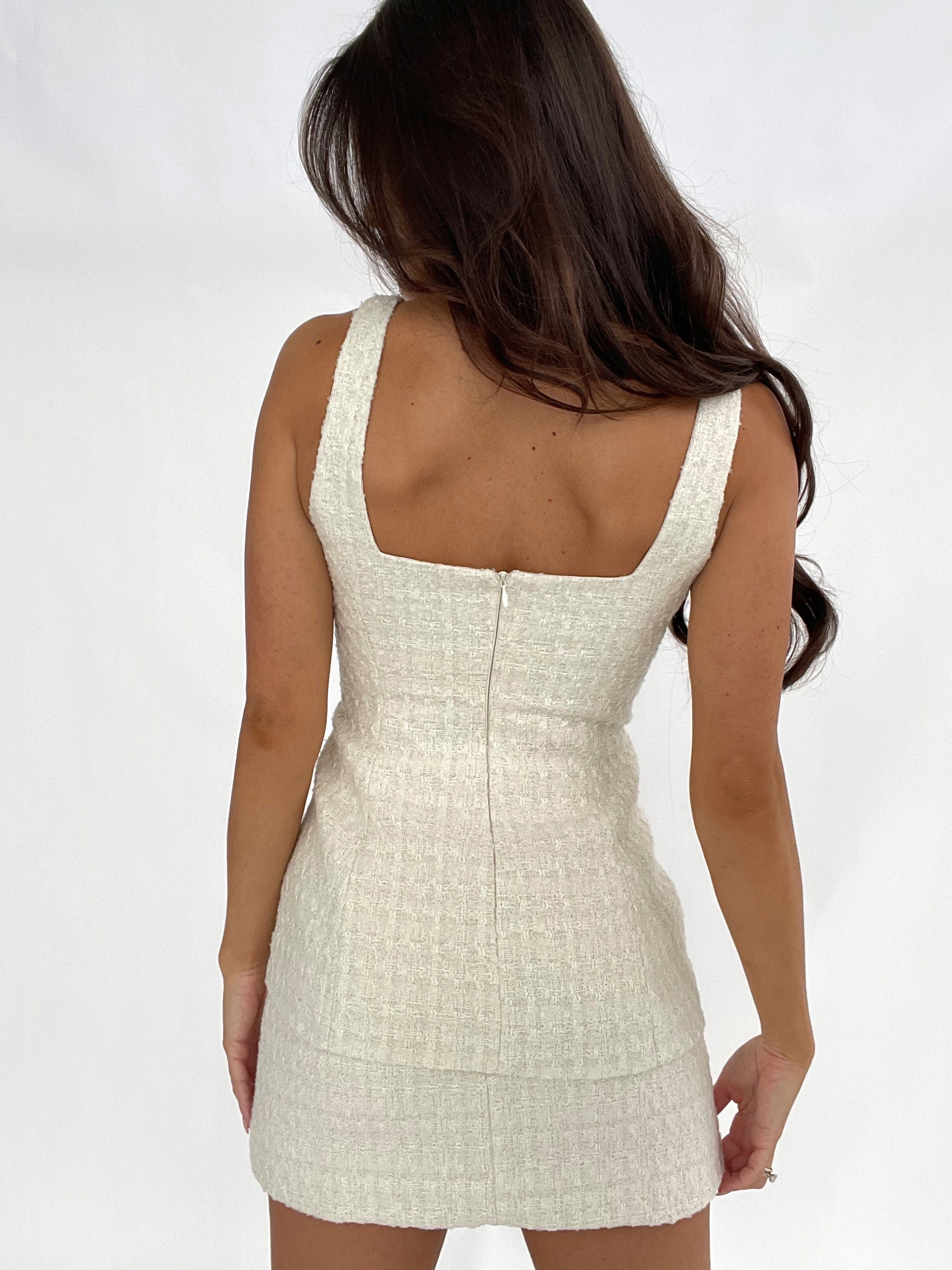 This Cream Tweed Bow Tunic Top features a zipper closure in the rear and a bow detail, adding a touch of sophistication to your wardrobe. The sleeveless design and non-stretch material provide a comfortable and flattering fit. Perfect for any occasion, this top is a must-have for any fashion-forward individual.