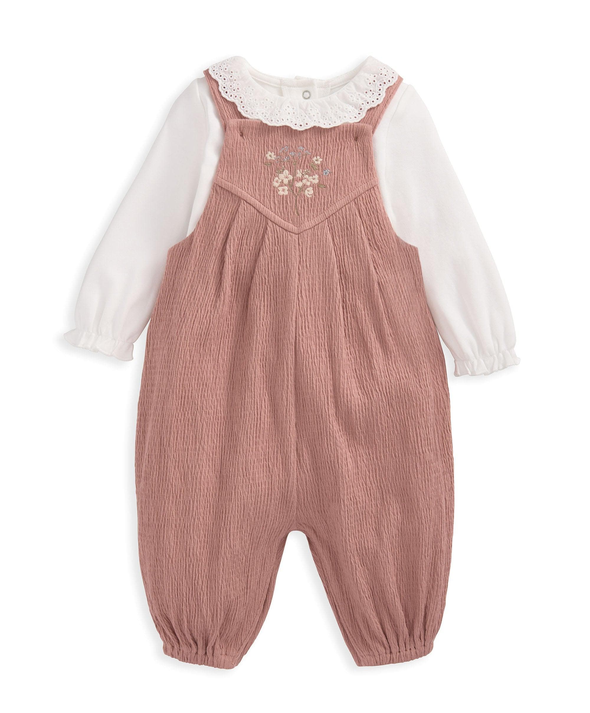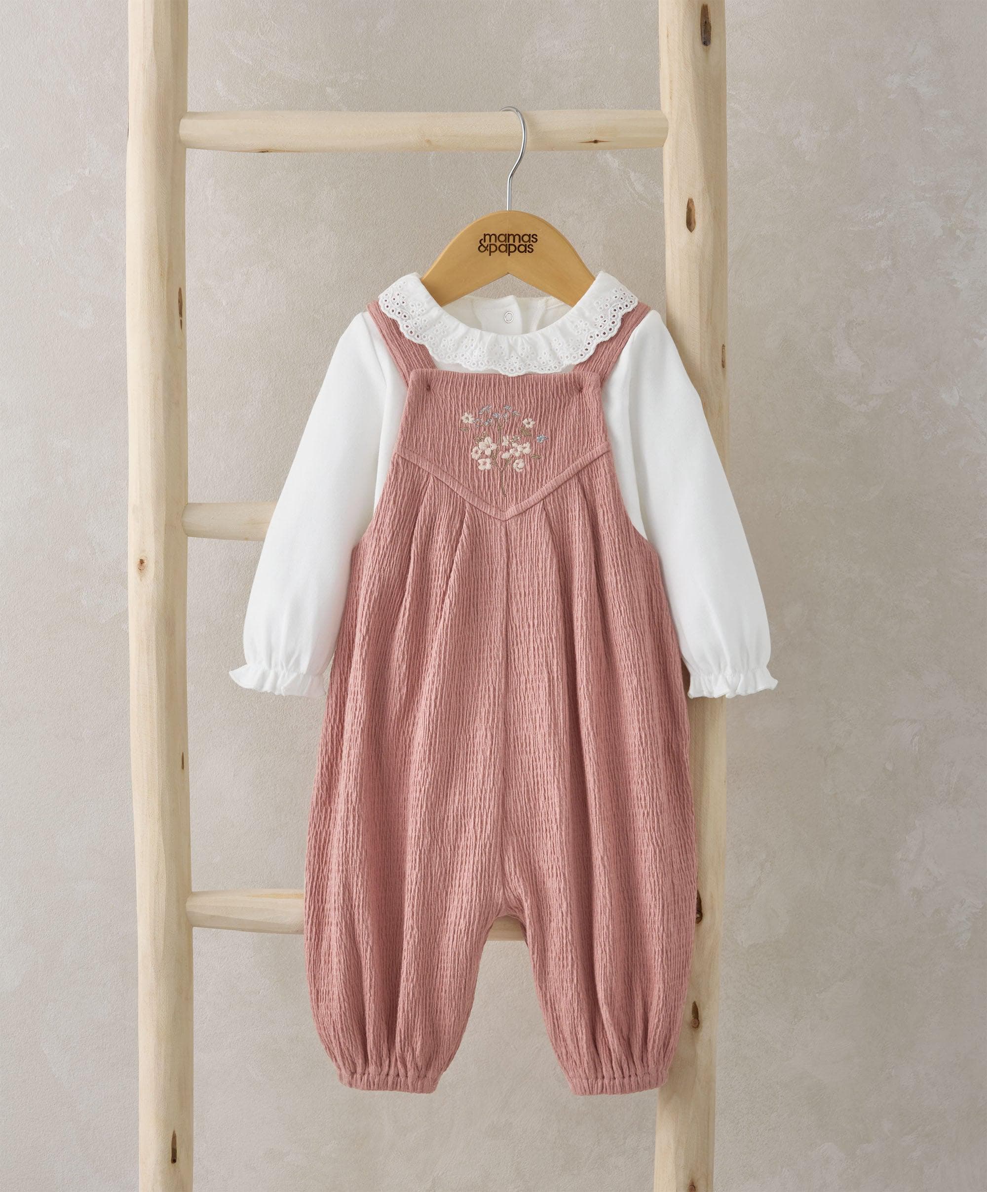 2-piece set, dungarees and bodysuit. Bodysuit with frill collar and cuffs. Crinkled jersey dungaree with flower embroidery and concealed buttons on straps. Popper fastening on crotch