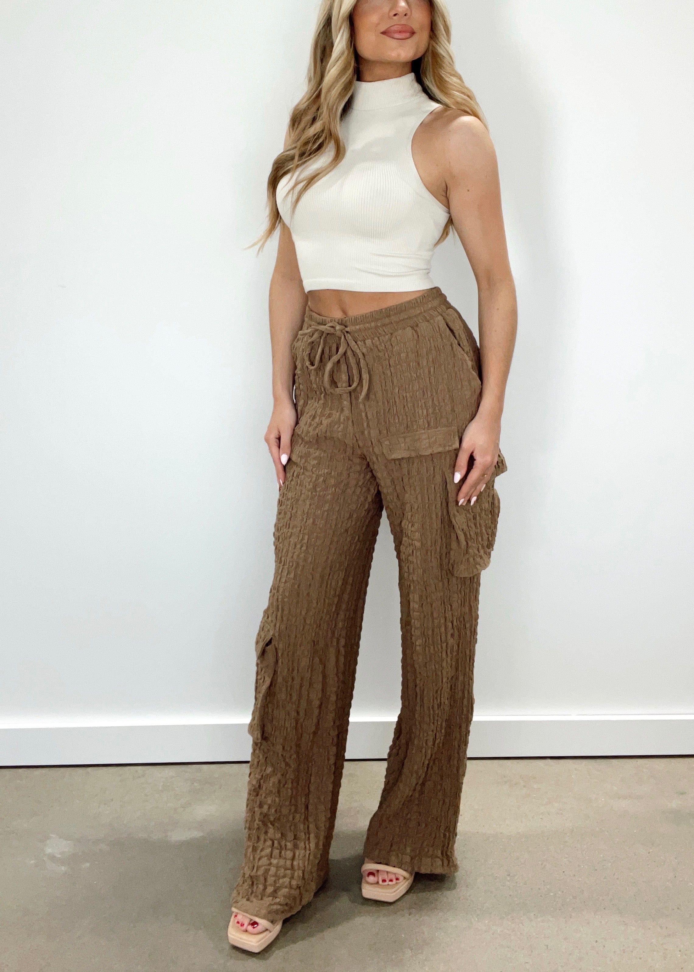 These Crinkle Knit Cargo Pants will be a luxurious addition to any wardrobe. Uniquely textured and designed with an adjustable drawstring waistband and stretchy elastic waistband, these pants offer comfort, style, and a contemporary, elevated look. Featuring pocket details and a straight leg fit, they guarantee an effortlessly versatile look that's truly one of a kind. Perfect for any occasion, these trendy neutral cargo pants provide an exclusive touch to your wardrobe.