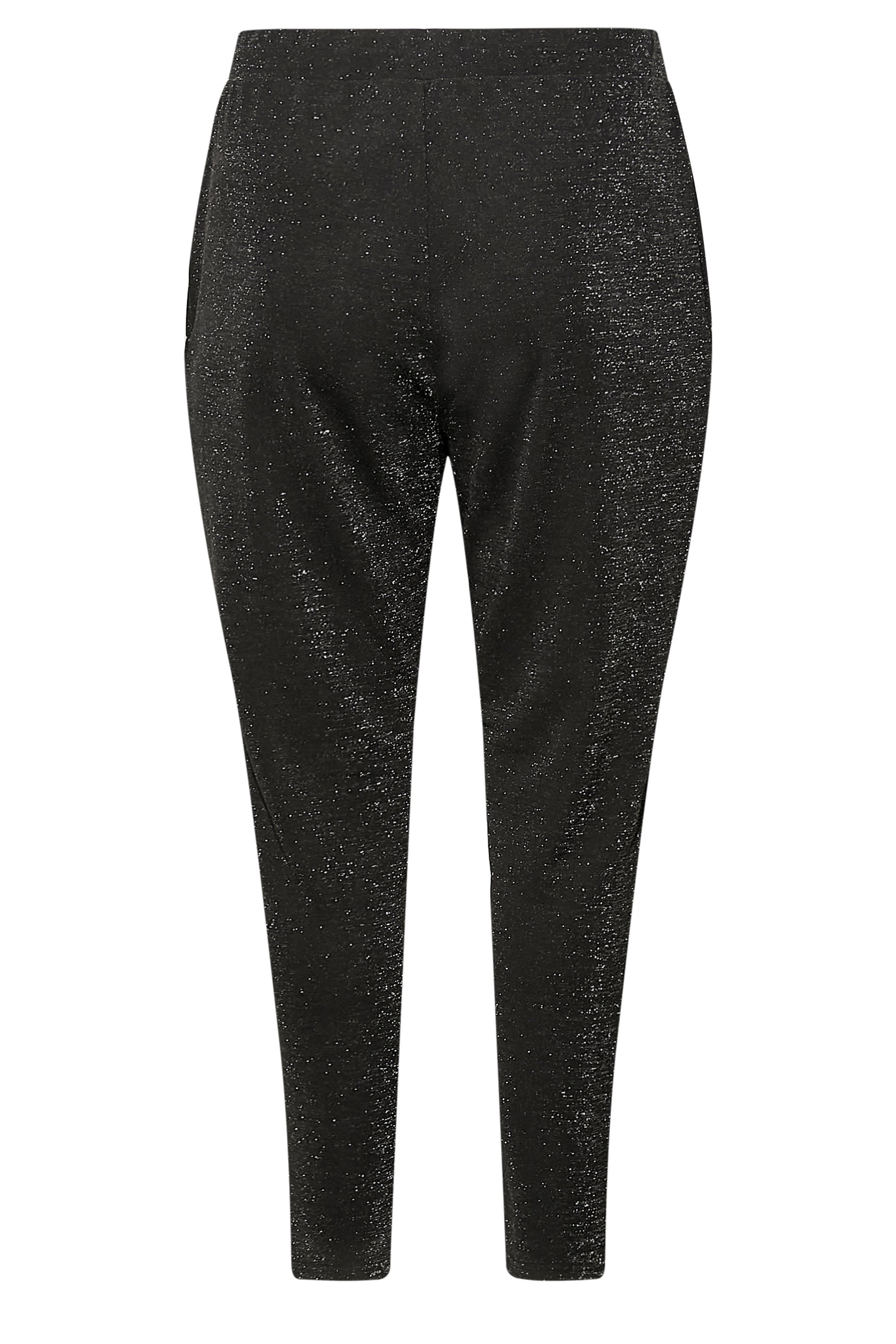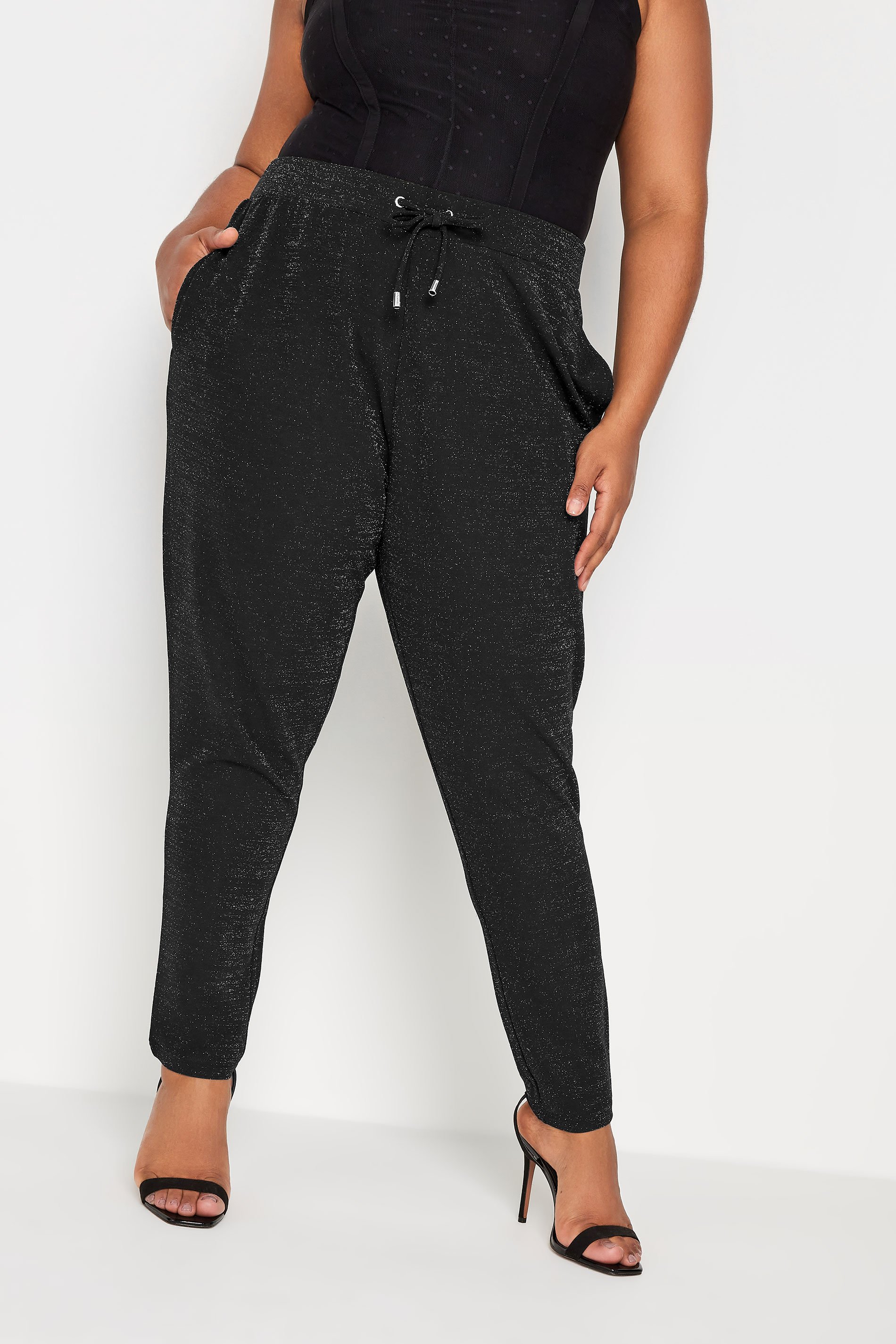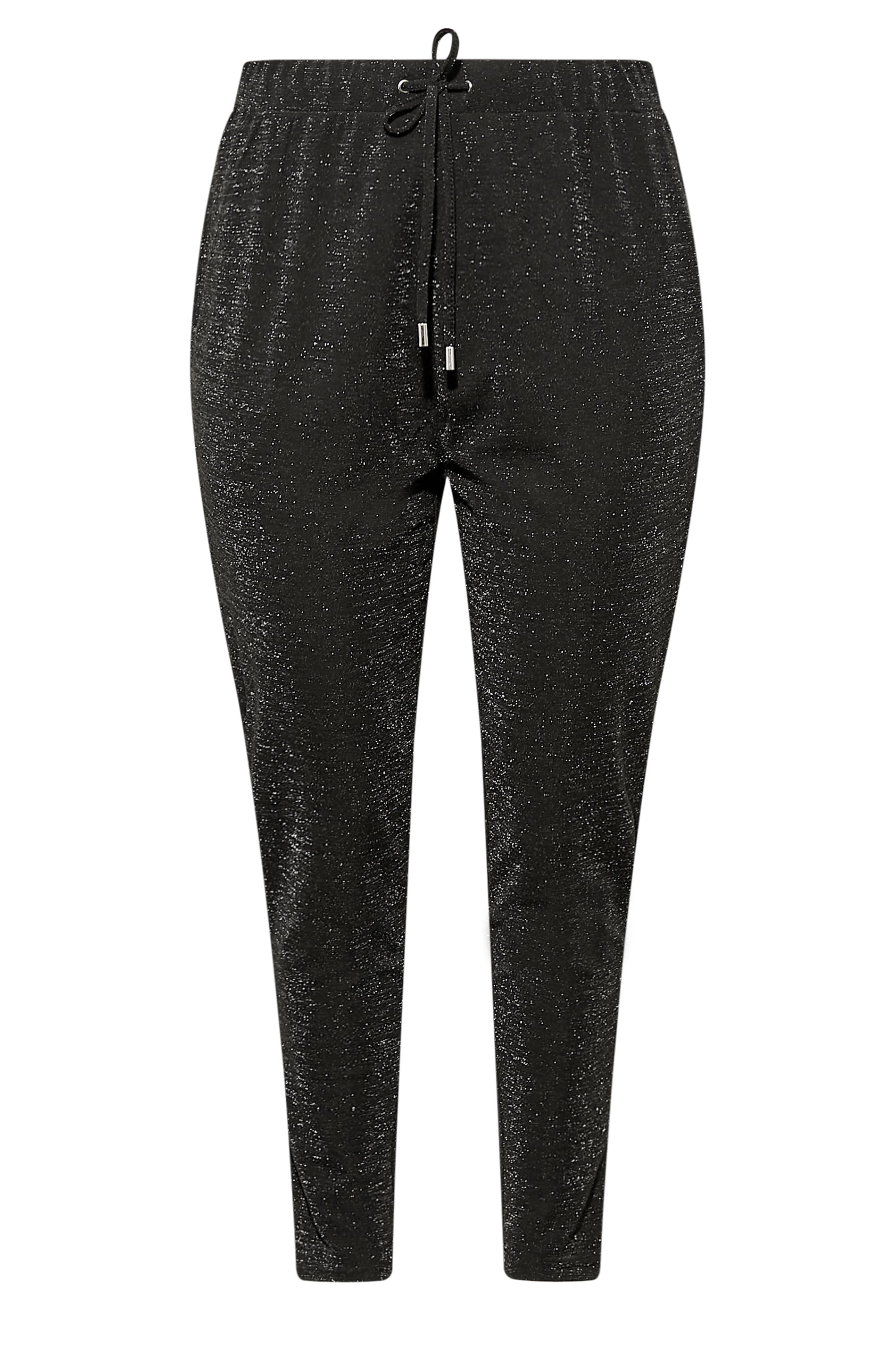 Did someone say girls night? This pair of glitter harem joggers are a must-have. Made from a comfortable jersey fabric, they feature an elasticated waistband with a drawstring tie and two side pockets. Pair with a bodysuit and heels for your next night out.
