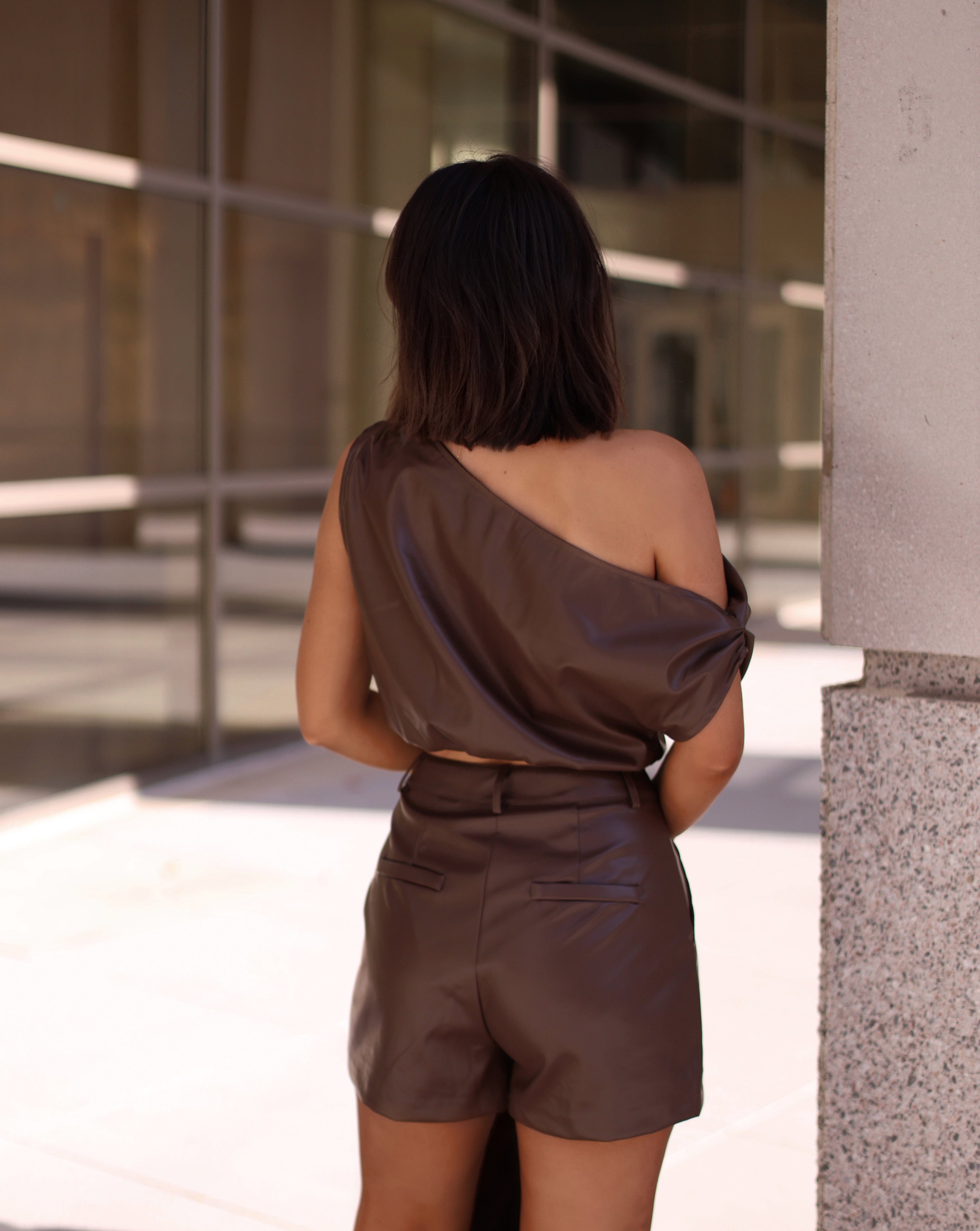 These dark brown leather shorts feature a button and zipper closure, front and faux back pockets, and an optional belt loop design. Made with limited stretch material, these shorts provide a snug and comfortable fit, while the leather-inspired look adds a bold touch. Perfect for any occasion, these shorts combine style and comfort for a versatile piece.