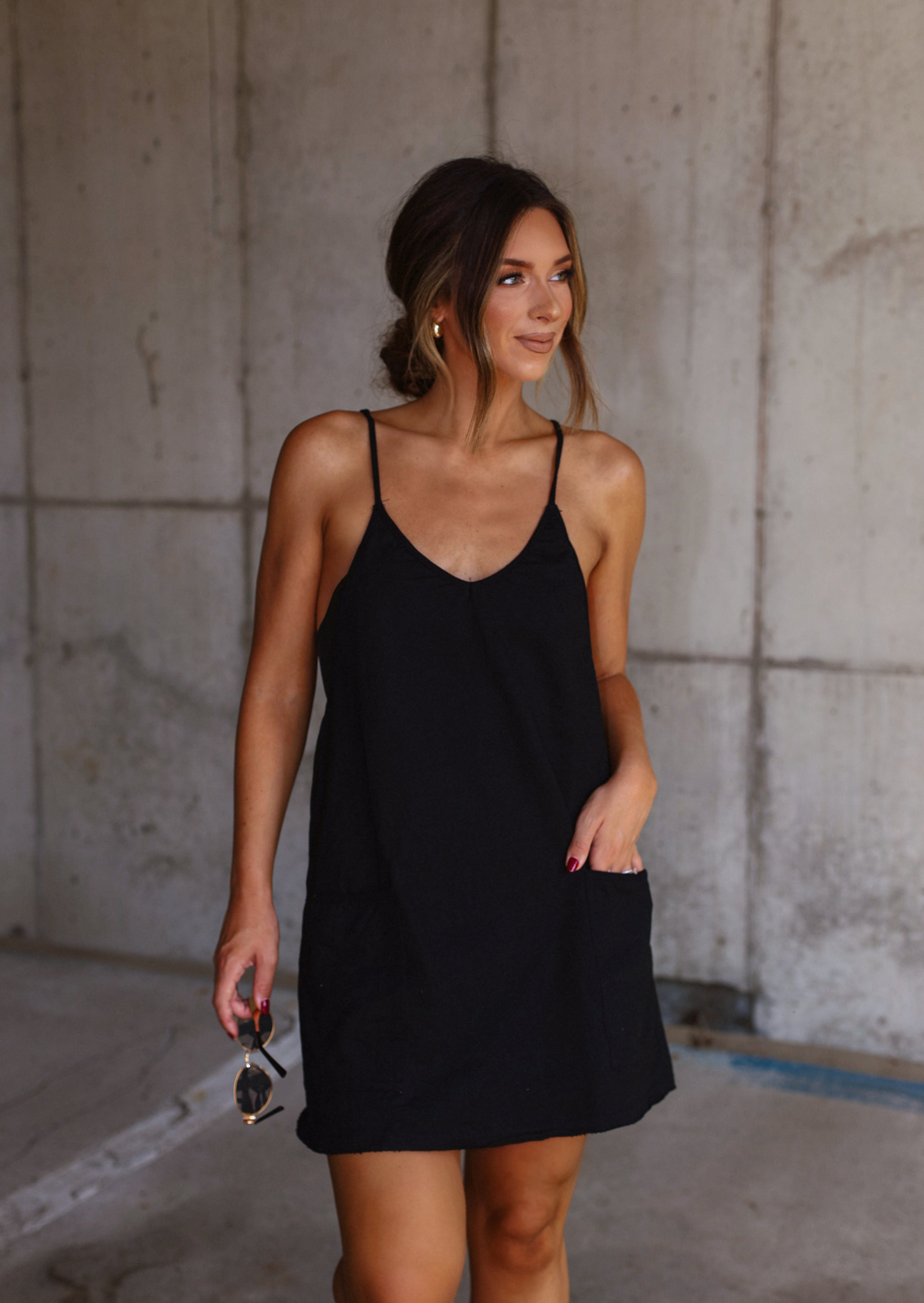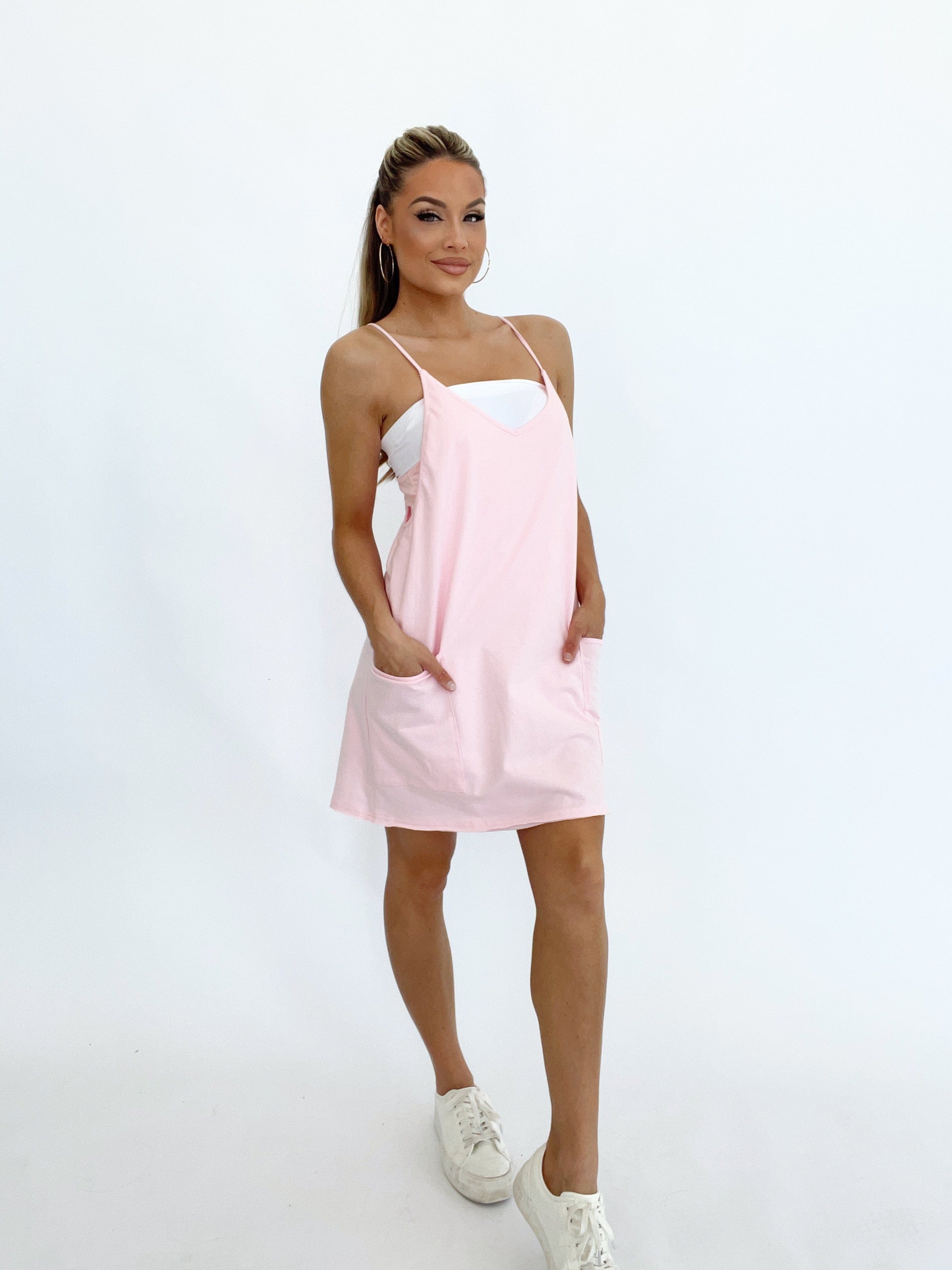 Introducing the Daybreak Romper Dress - the perfect combination of comfort and style. Featuring built-in shorts, a v-neckline, and mini fit with built-in lining for added support. Pocket details and thin adjustable straps add functionality, while the racerback design and vibrant pop of color make a statement. Elevate your athleisure wardrobe and wear it for coffee runs, lounging, shopping, or a fun summer day.
