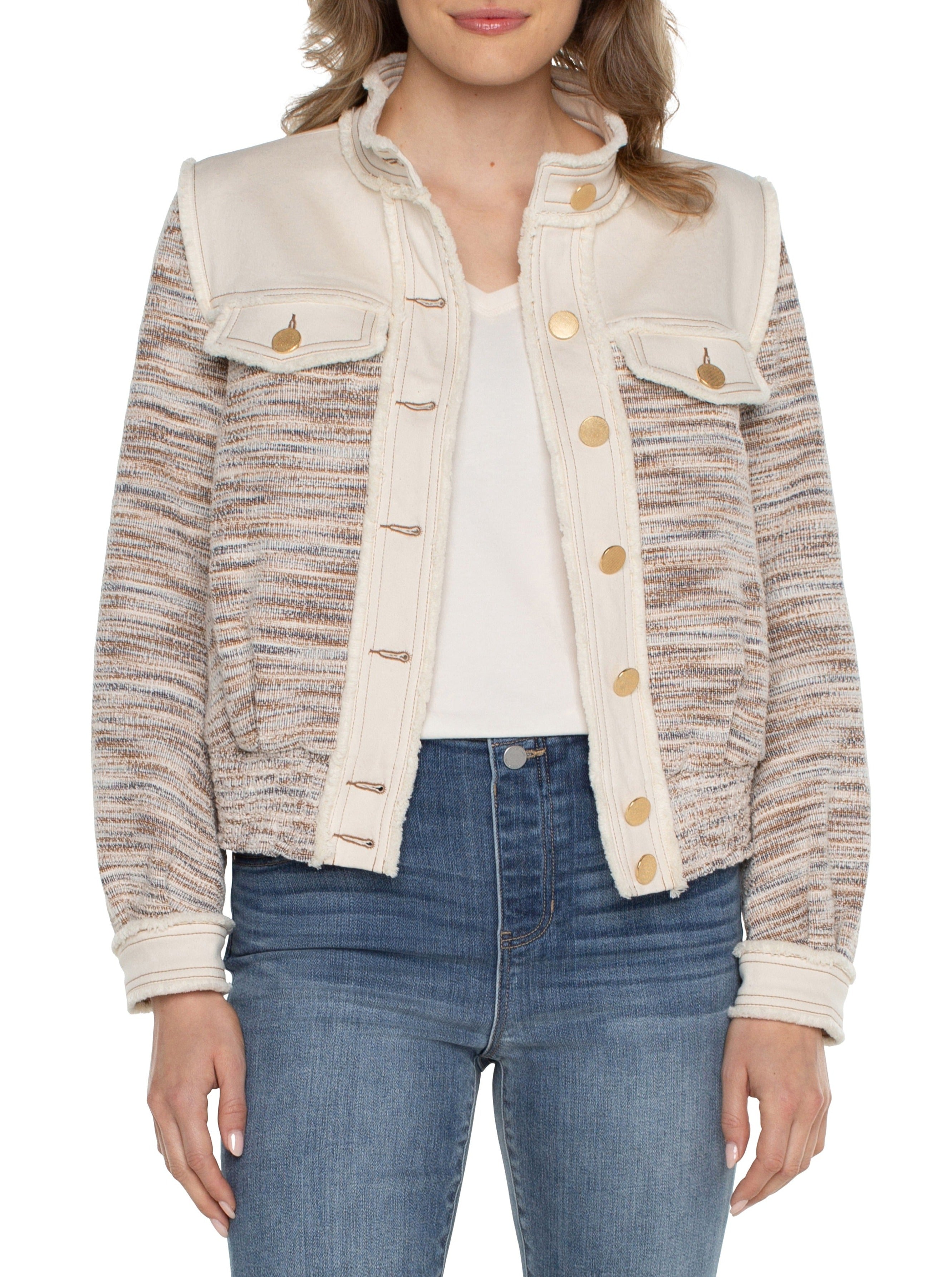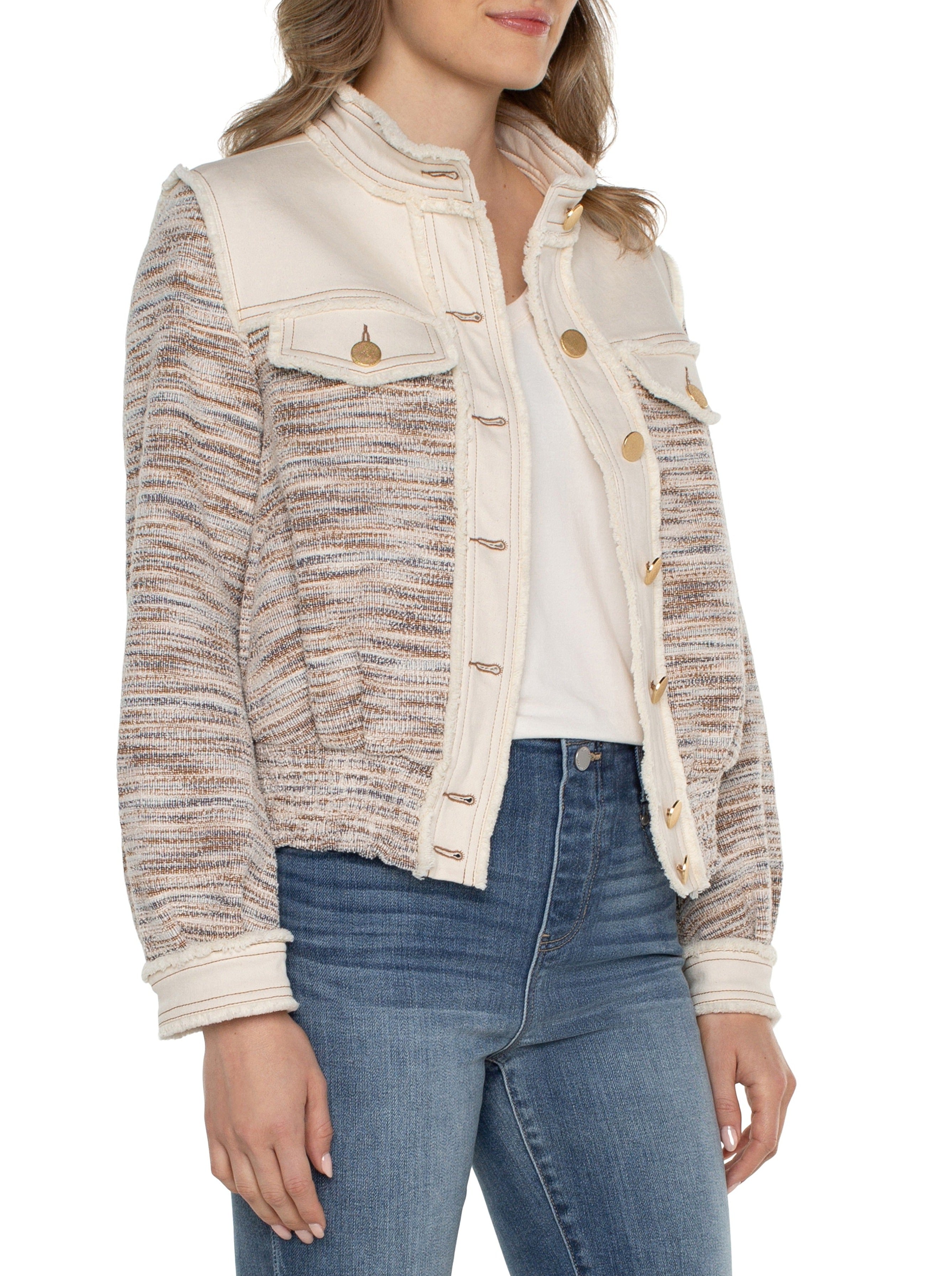 - Denim and boucle knit mixed texture fabrics