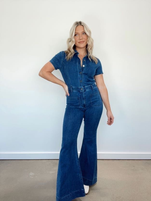 Discover the epitome of chic sophistication with the Denim Flair Jumpsuit. Crafted from ultra-stretchy dark wash denim, this flair-fit jumpsuit showcases a collared neckline and button closures for a timeless silhouette. With chic pocket details for a touch of exclusivity, this stylish and elevated piece is the perfect transitional garment for the spring and summer months.