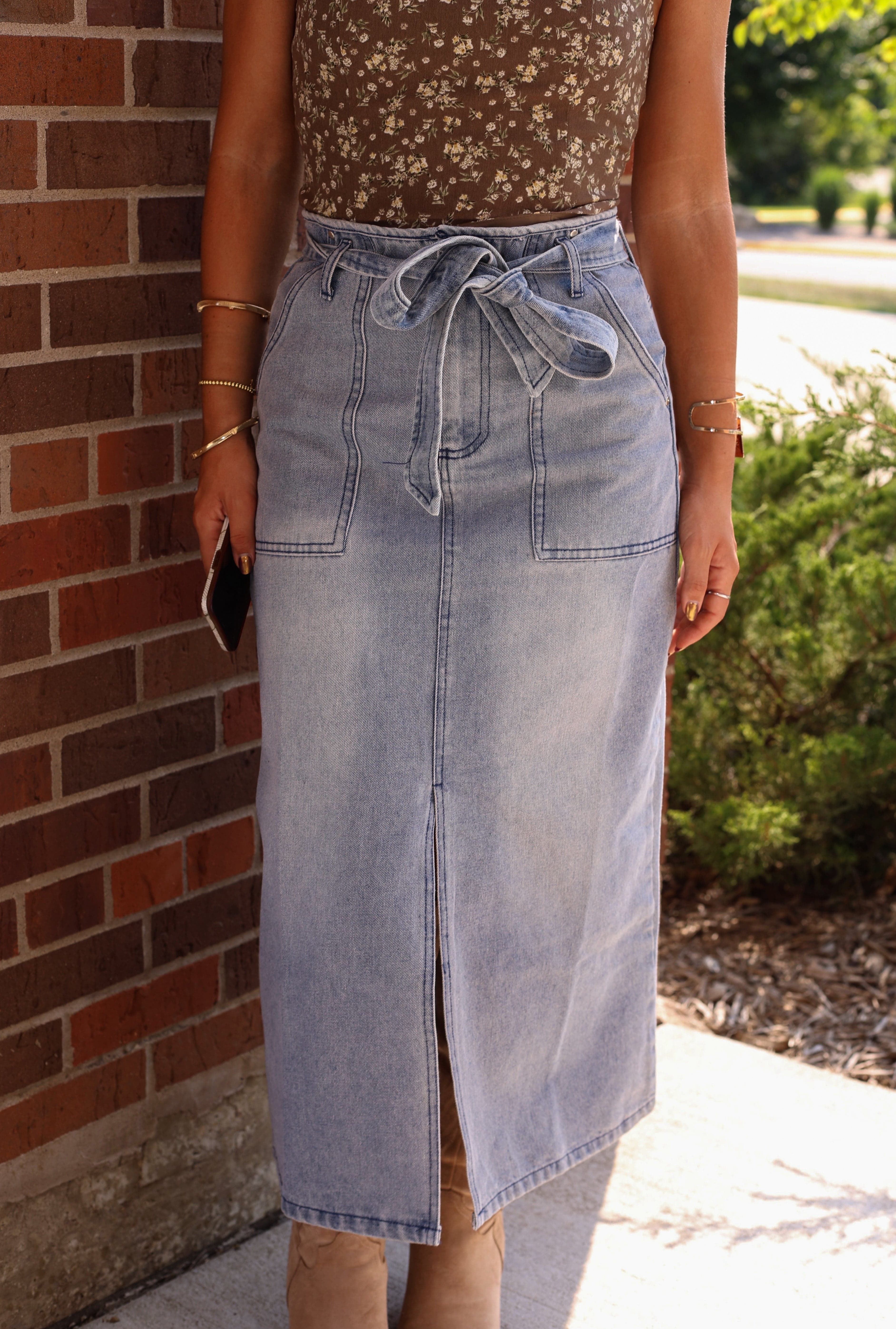 The Denim Tie Waist Midi Skirt is the perfect blend of style and comfort. Made from a soft cotton, this denim style skirt boasts a flattering tie waist and a fashionable midi length. The unique front seam split adds a touch of subtle elegance. Paired with our , the model showcases a classy look!
