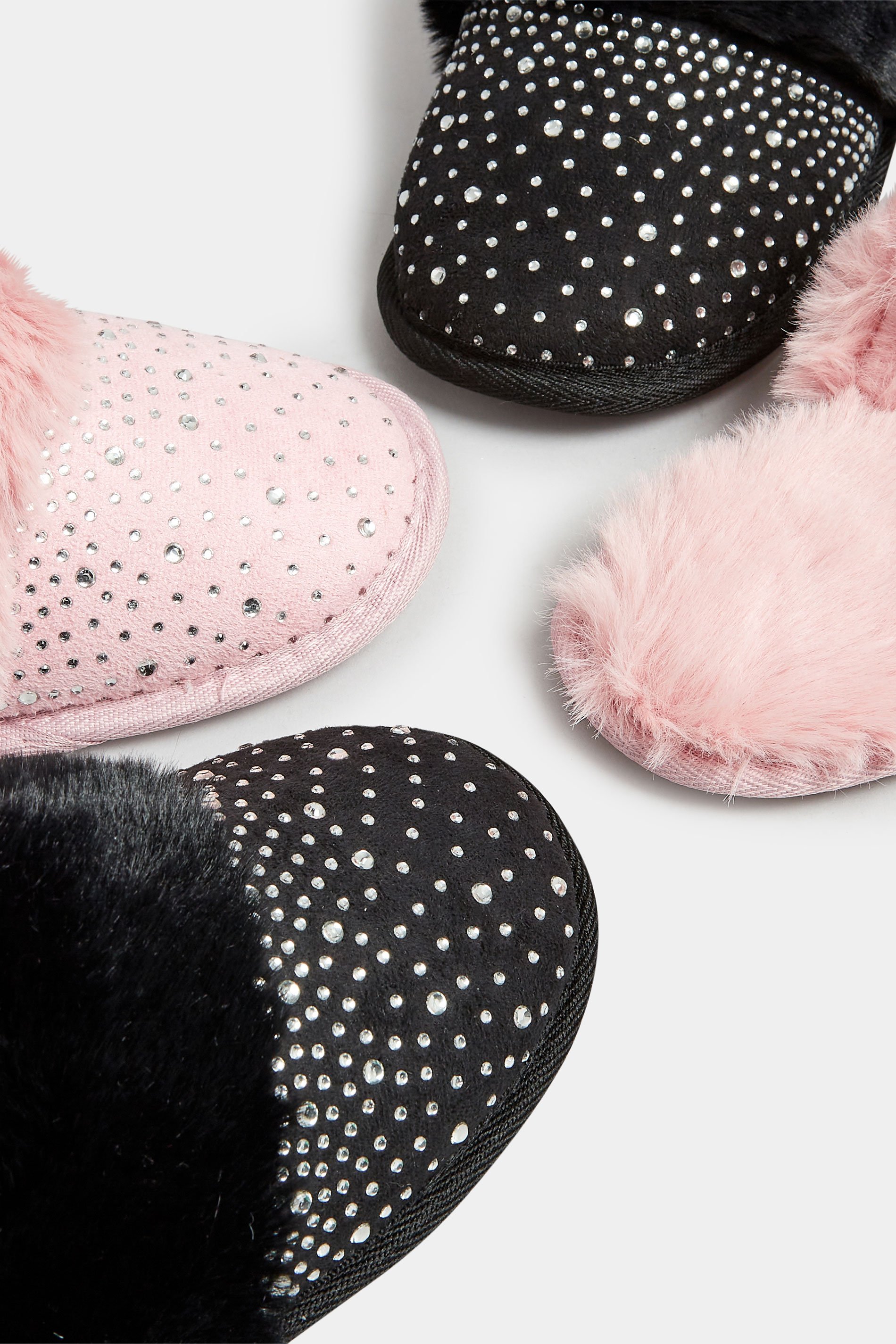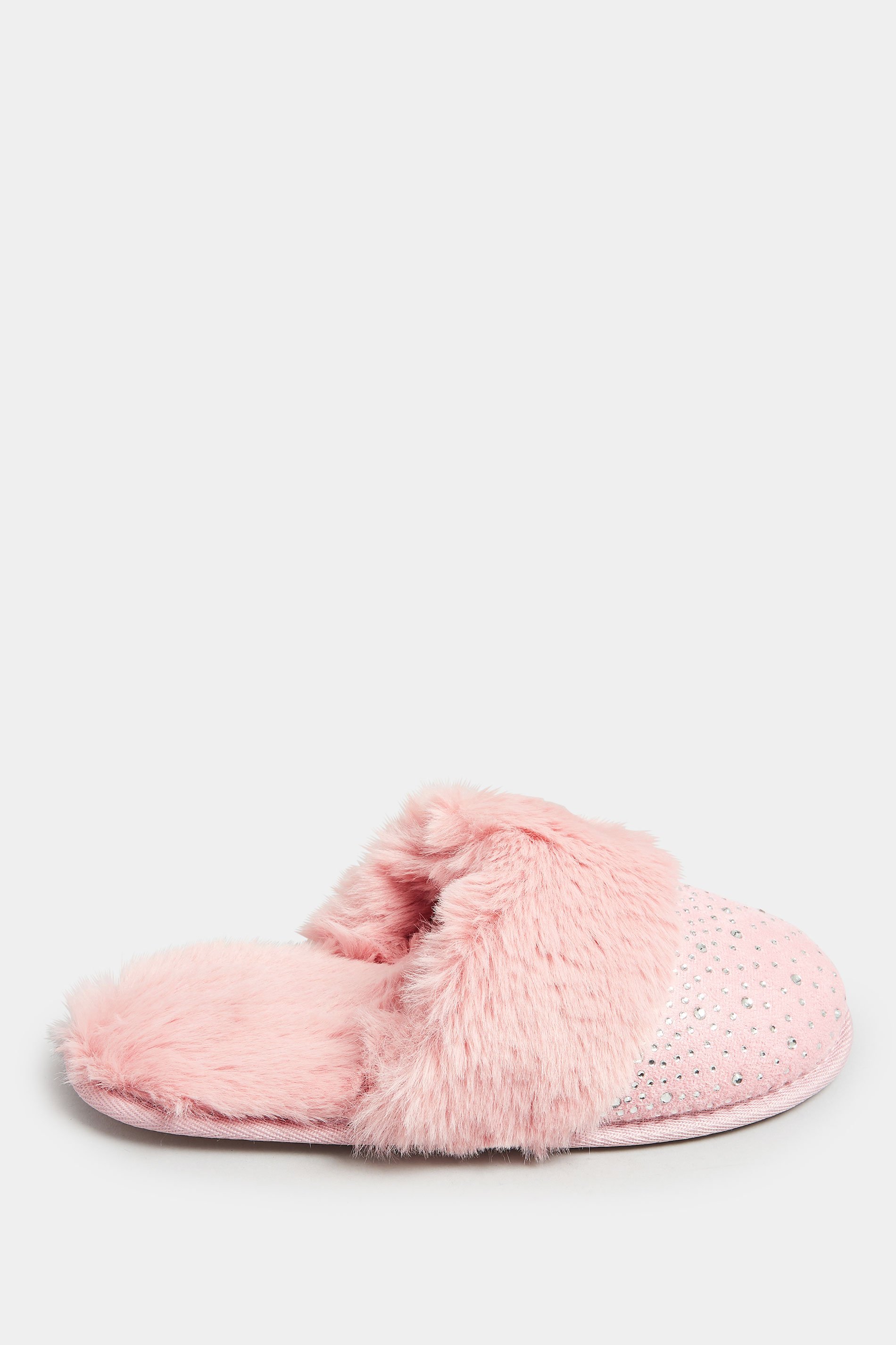 Pink Diamante Faux Fur Slippers In Wide E Fit