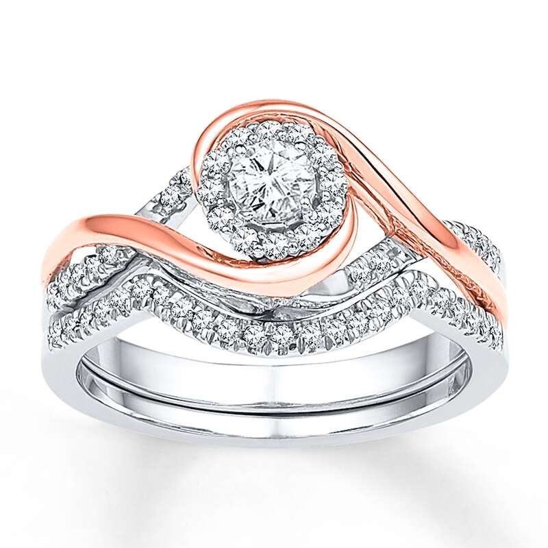 This alluring bridal set for her features a round diamond encircled in more round diamonds at the center of the engagement ring. Swirls of 10K rose embrace the center while diamonds decorate the 10K white gold band. A matching 10K white gold wedding band decorated with round diamonds is contoured to fit perfectly alongside the engagement ring. The bridal set has a total diamond weight of 1/3 carat.