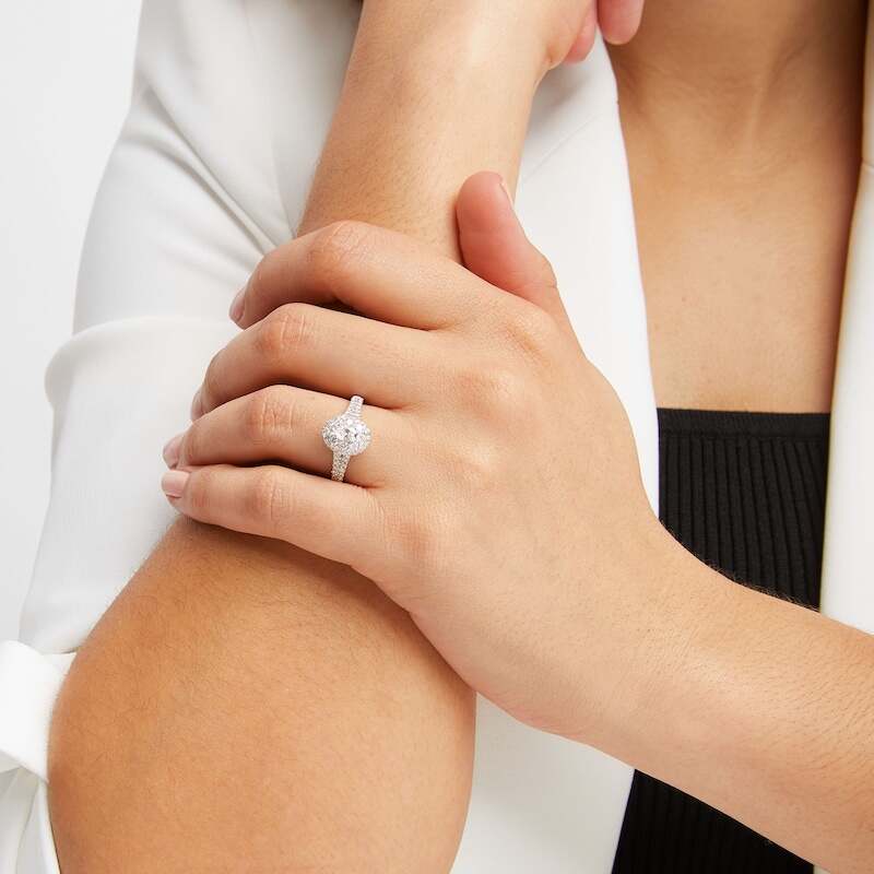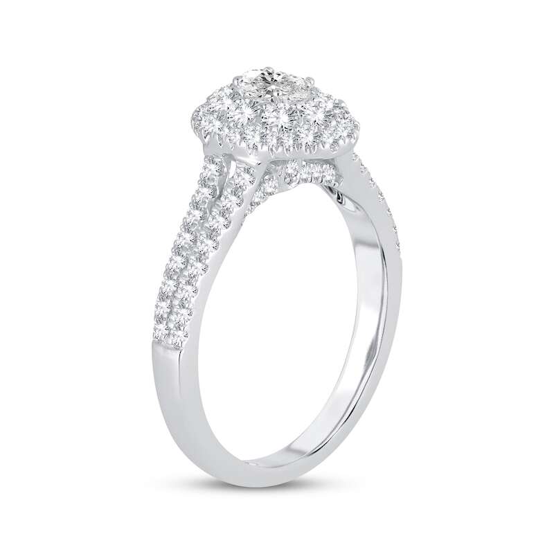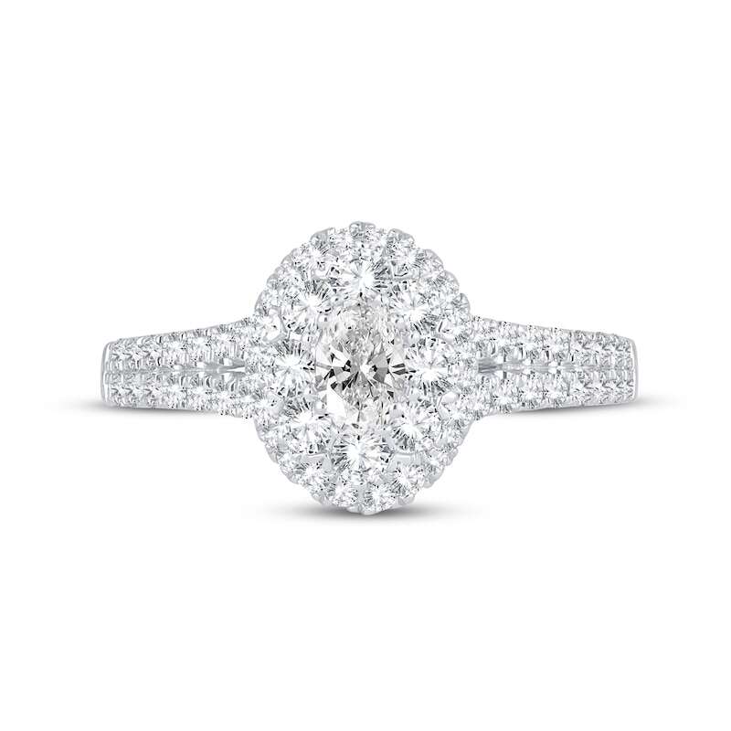 A tribute to your timeless love, this beautiful engagement ring showcases a 1/4-carat oval-cut diamond surrounded by a double halo of round diamonds at the center. Two rows of round diamonds shimmer down the split-shank band and gleam across the bridge. The ring is styled in 14K white gold with a rhodium finish and has a total diamond weight of 1 carat. From the Now & Forever? bridal collection.
