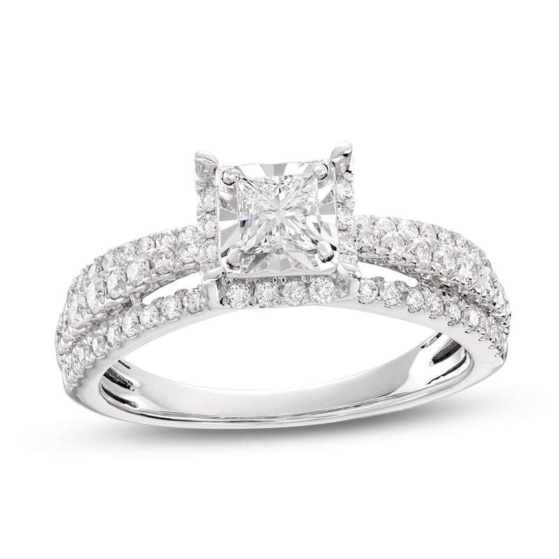 Sparkling with modern elegance, this engagement ring showcases a stunning princess-cut diamond at the center, artfully set to enhance size and sparkle. Radiant round diamonds trace the center design and sweep down the split-shank band in three dazzling rows. The ring is crafted in iconic 14K white gold and has a total diamond weight of 1 carat. From the Now & Forever® bridal collection.