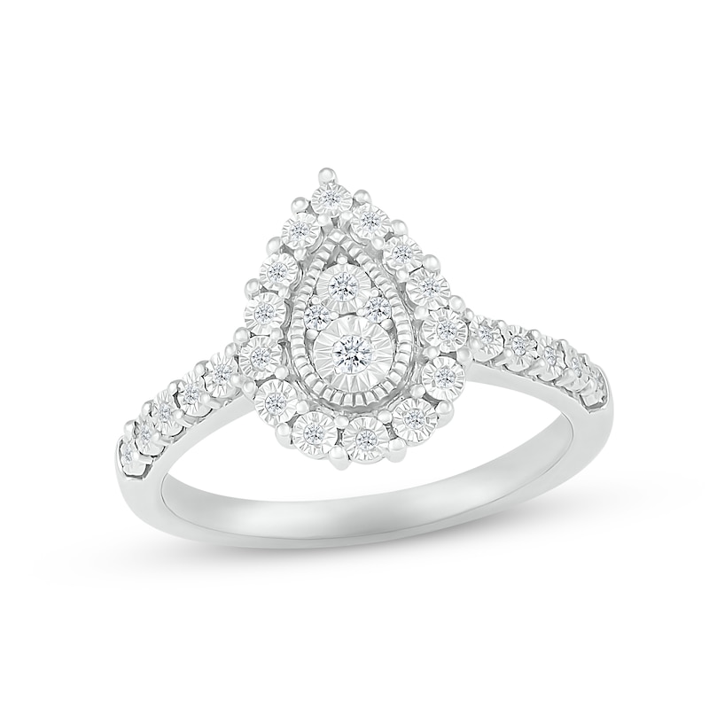 Dazzle her with this unique and elegant promise ring, featuring brilliant round diamonds that are artfully set to enhance size and sparkle. A pear-shaped quartet of twinkling round diamonds is surrounded by milgrain detailing. More round diamonds halo the center and shimmer halfway down the sterling silver band. The ring has a total diamond weight of 1/10 carat.