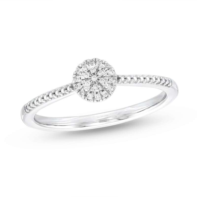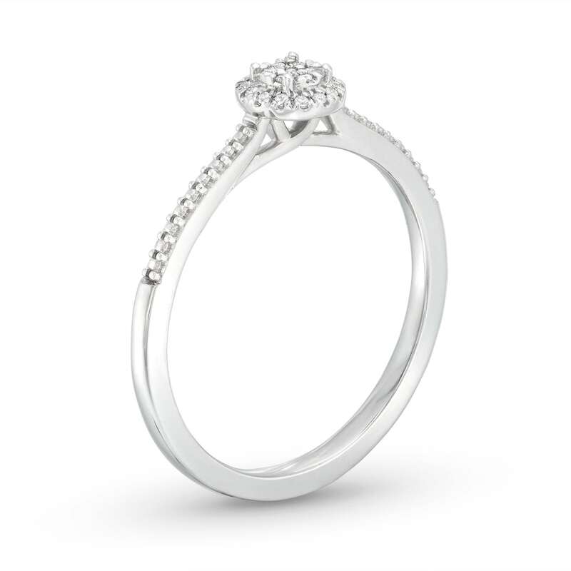 For a love that sparkles, this beautiful promise ring shines as true as your words. A bright cluster of round-cut diamonds radiates from the center when embraced with a shimmering surround of more round diamonds. Styled in sterling silver, the ring has a total diamond weight of 1/20 carat.
