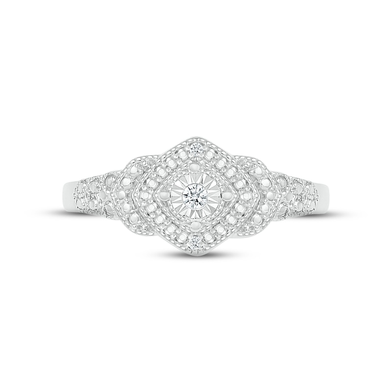 Make a sweet statement with this stunning promise ring. A brilliant round diamond, artfully set to enhance size and sparkle, shines on the cushion-shaped center. Eye-catching texturing and a gently scalloped silhouette complete the sterling silver band.