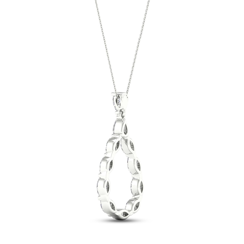 Dazzling marquise and pear-shaped diamonds trace a beautiful teardrop design on this gorgeous necklace for her. Fashioned in iconic 14K white gold, the necklace has a total diamond weight of 1 1/2 carats. The pendant sways from an 18-inch cable chain that secures with a lobster clasp.