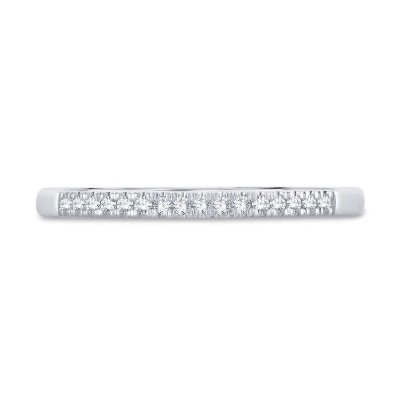 This gorgeous diamond wedding band showcases a classic design to perfectly complement her matching engagement ring (sold separately). Set in iconic 14K white gold, brilliant round diamonds embellish the band, totaling 1/15 carat in weight. From the Now & Forever? bridal collection.