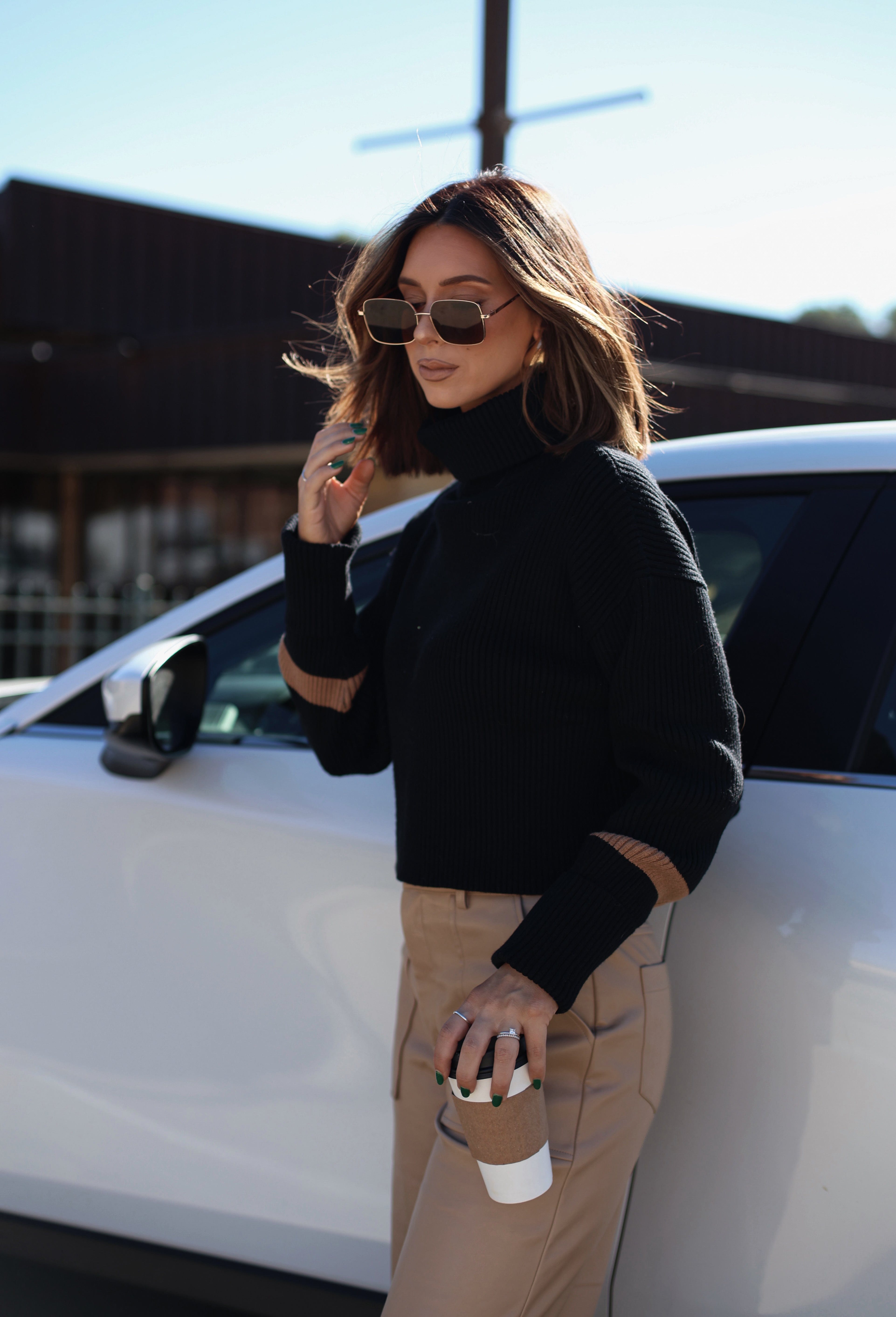 Stay snug and effortlessly stylish this fall with our Dinner Plans Sweater. Fashioned with a turtleneck, tan stripe detailing, and a relaxed fit, the Dinner Plans Sweater is crafted from a super soft and stretchy knit for an elevated, sophisticated look. Ribbed and cozy, wear it for dinner, drinks, or shopping for any occasion with unparalleled warmth and versatility.