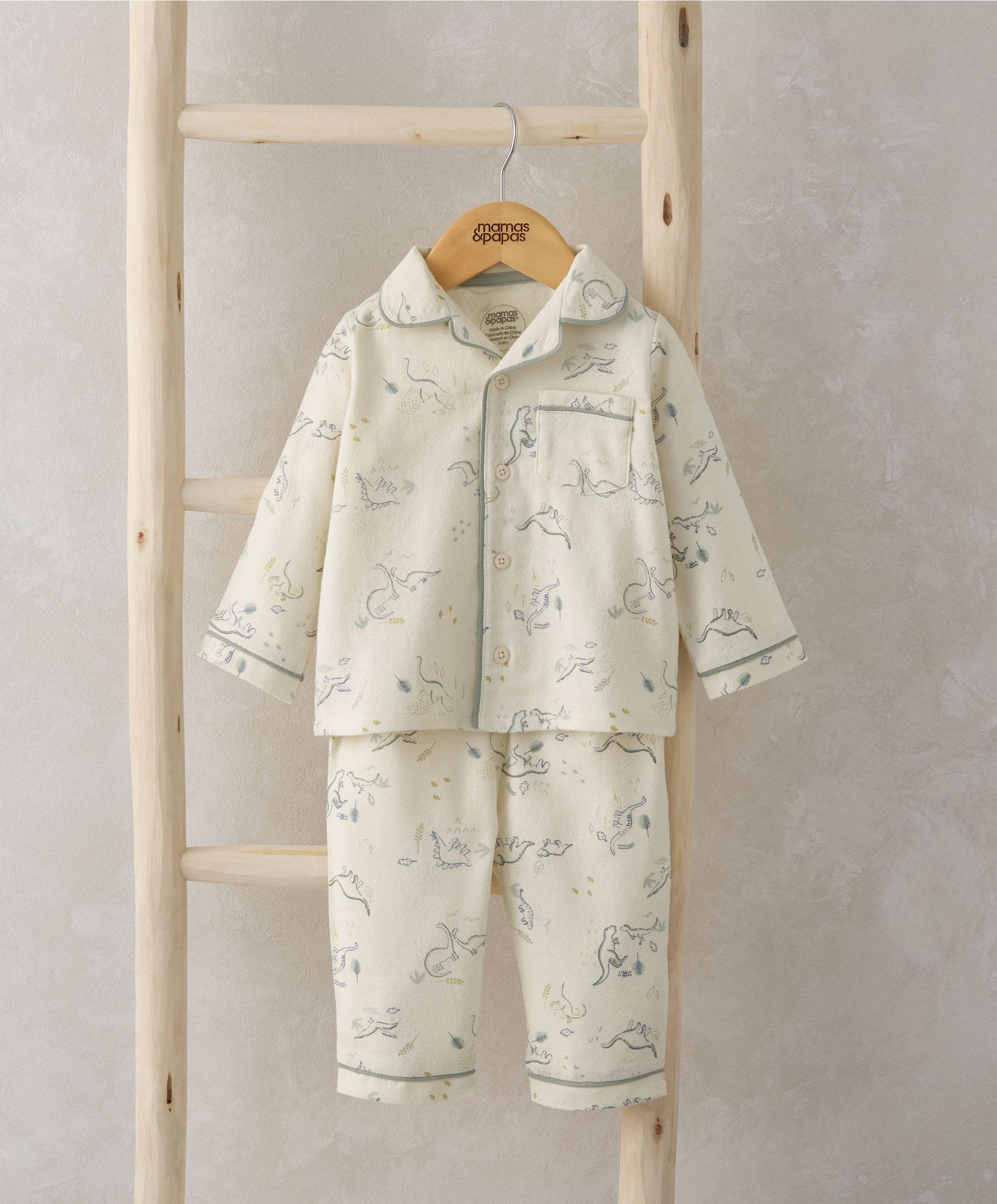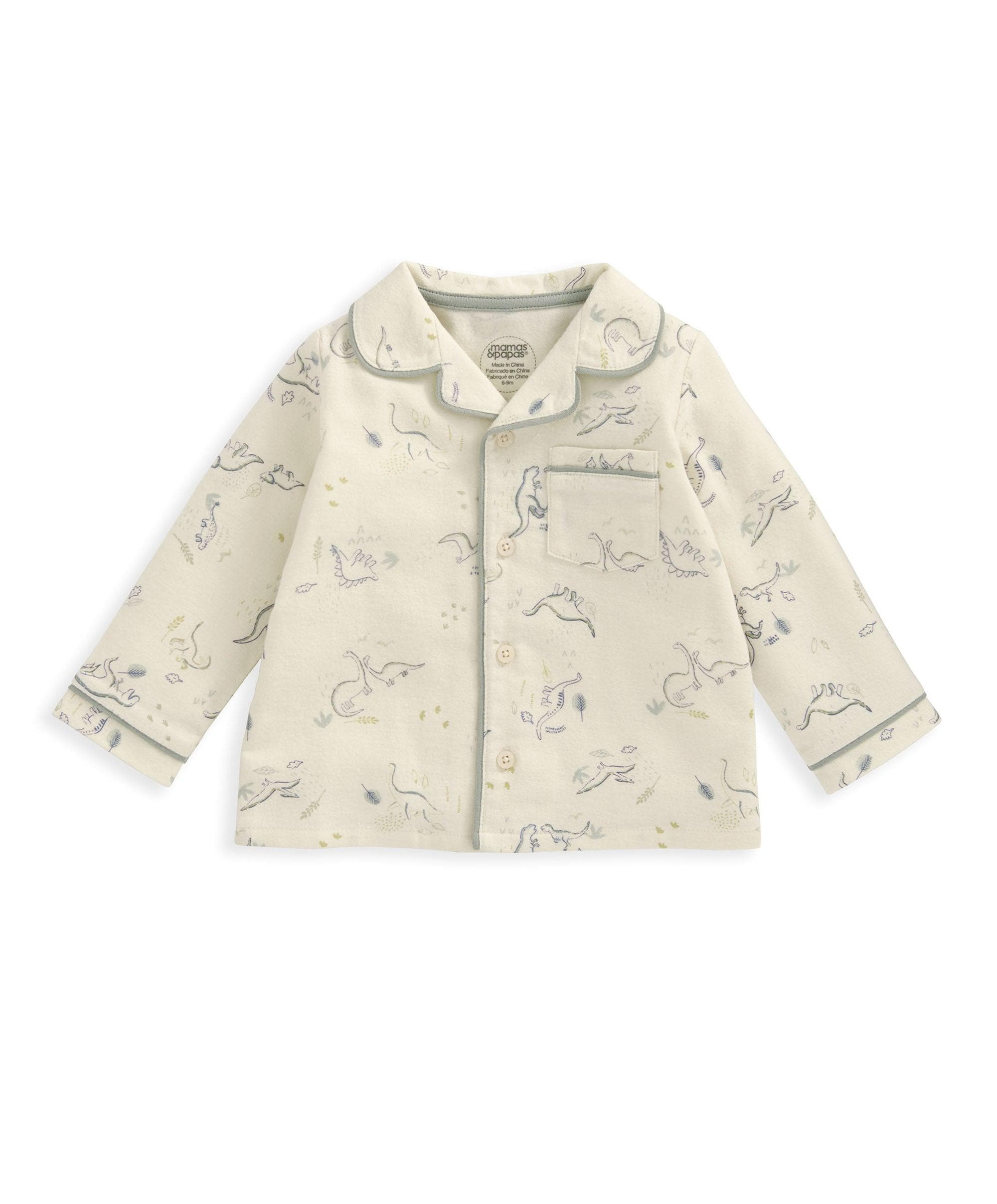 Dino print pyjamas. Collared top with piping detail on cuffs and collar. Bottoms with piping detail on cuffs.