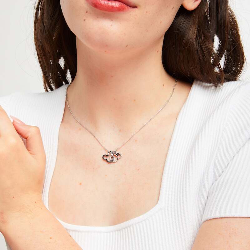 The Disney Treasures collection presents this enchanting necklace featuring Disney's Mickey and Minnie Mouse, perfect to add to their collection. The pendant features the iconic pair's silhouettes traced in glittering garnets and black and white round diamonds. The pendant is fashioned in sterling silver and features a black rhodium flash. A compassionate way to show your love, the necklace represents how the relationship of Disney's Mickey & Minnie reflects a playful spirit and a loving, life-long bond. The necklace has a total diamond weight of 1/8 carat, hangs from a 17-inch cable chain, and secures with a spring ring clasp. Exclusively at KAY Jewelers. ©Disney.