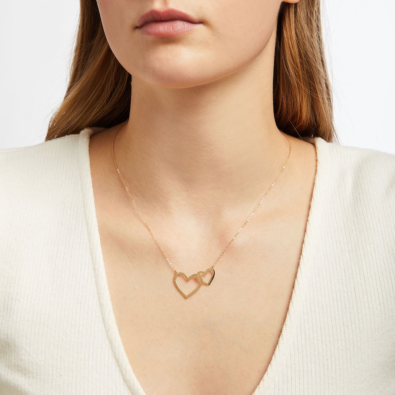 Celebrate the love that keeps you connected with this wonderful necklace. The endearing style features two interlocking hearts in a high-polish finish. Styled in 10K yellow gold, the pendant is suspended amidst a 16-inch cable chain and secures with a spring-ring clasp.