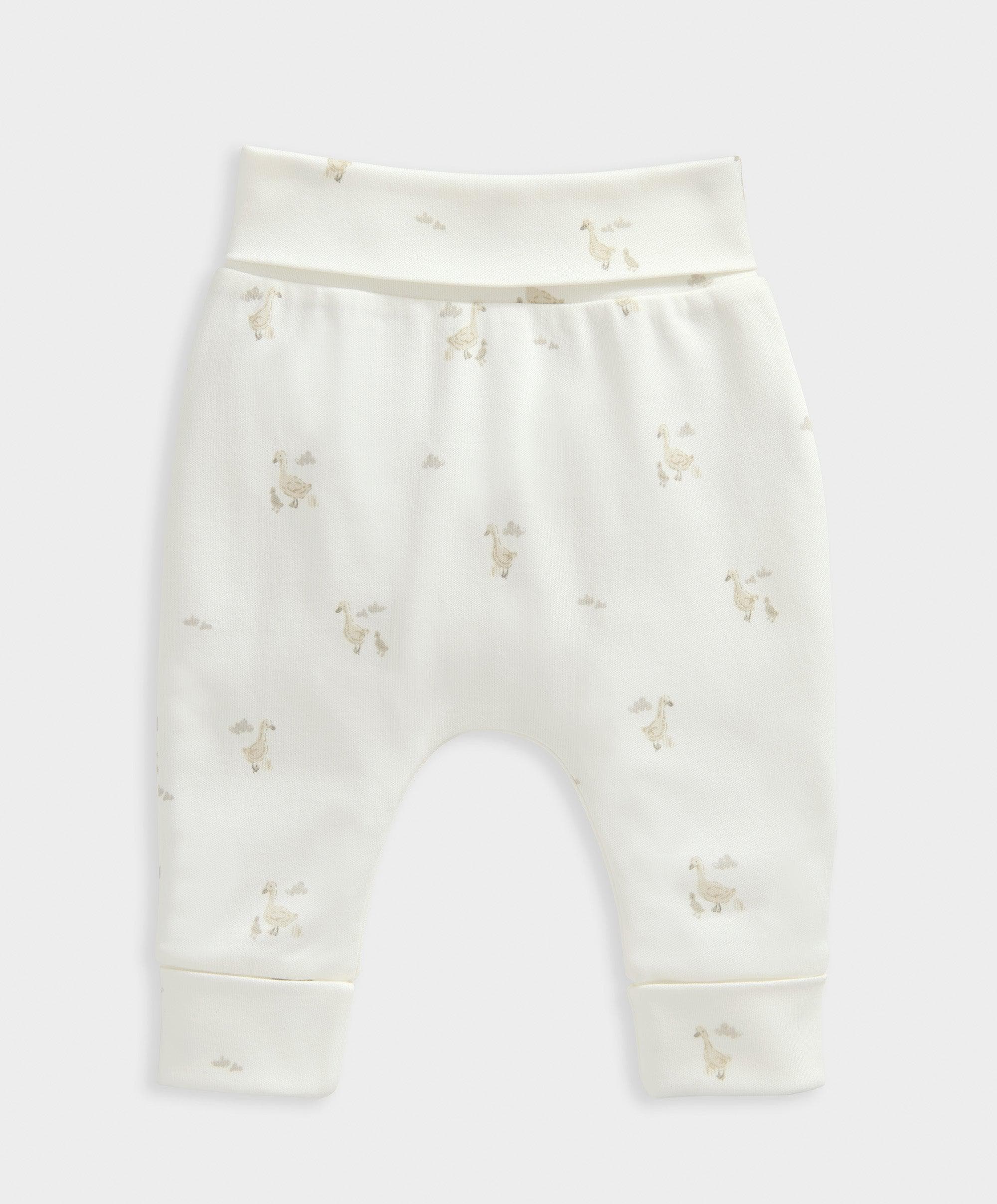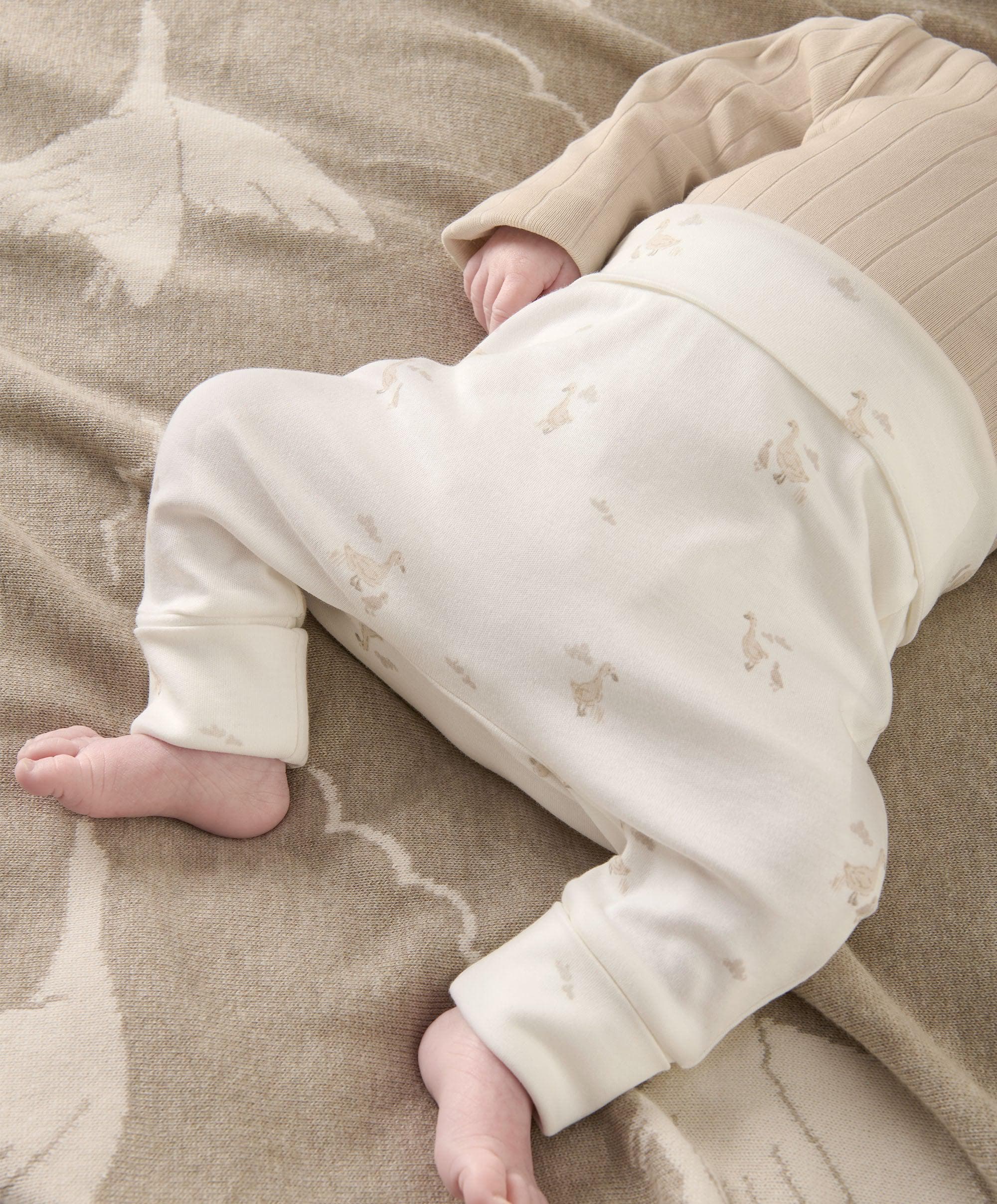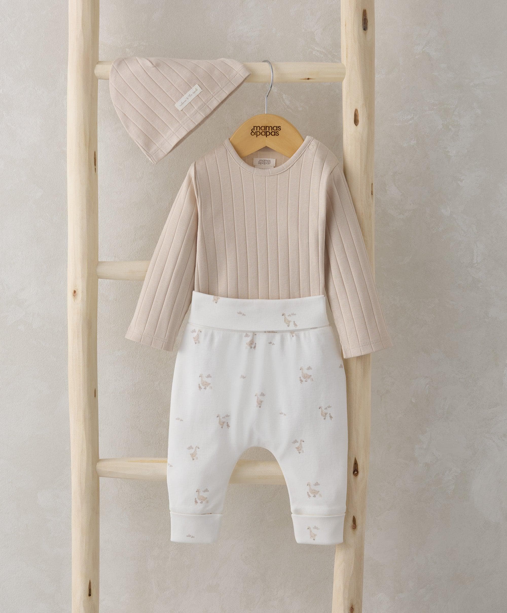 3-piece set, including oatmeal ribbed cotton long-sleeved bodysuit, with full popper fastening; matching duckling print leggings and hat made from 100% cotton.