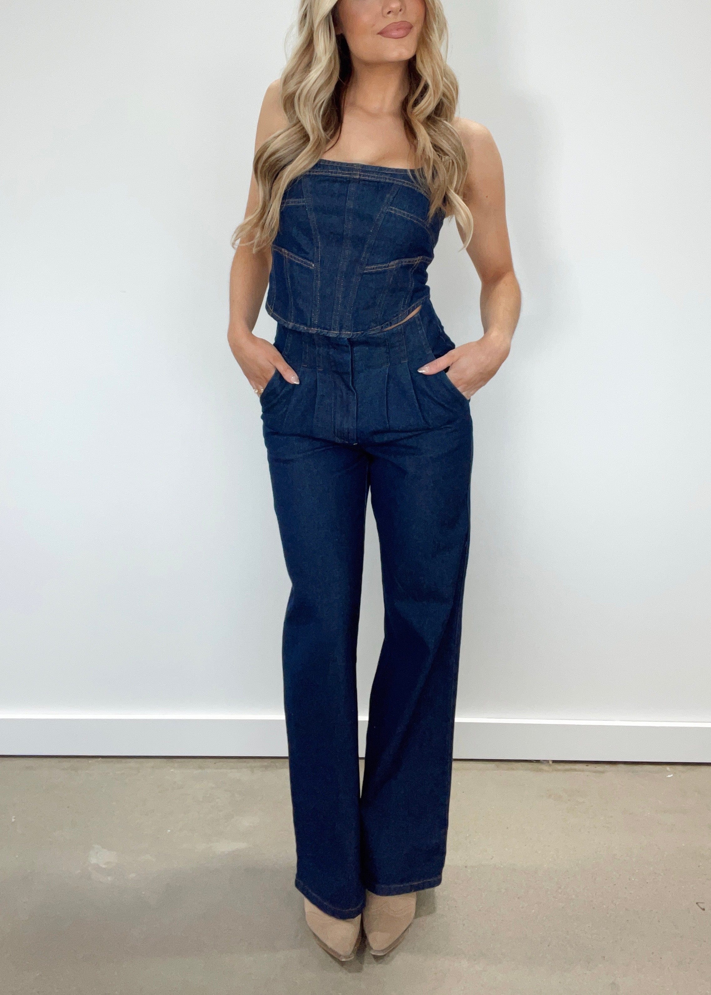 Elevate your style with our Dusk To Denim Pants. The high waisted, pleated design flatters while the dark wash and pocket details add sophisticated flair. The zipper closure ensures comfort while the straight leg silhouette exudes an exclusive NYC vibe, perfect for dinner, drinks, or shopping. Crafted for the chic, modern woman who values both style and comfort.