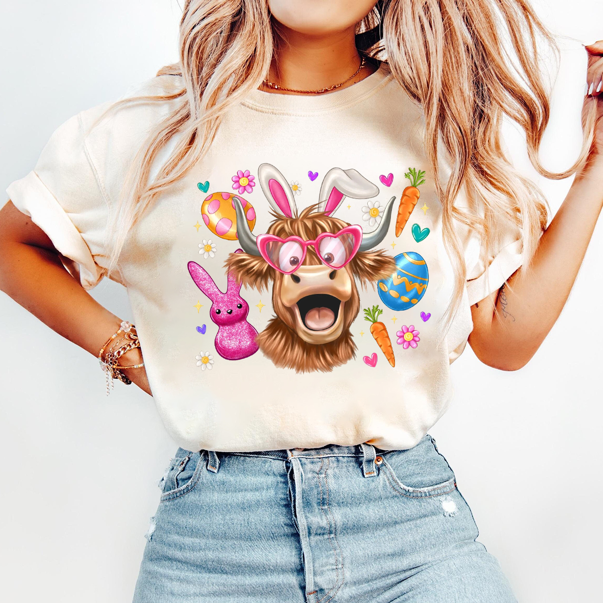Easter Bunny Highland Cow Eggs Printed Round Neck Short Sleeve T-Shirt