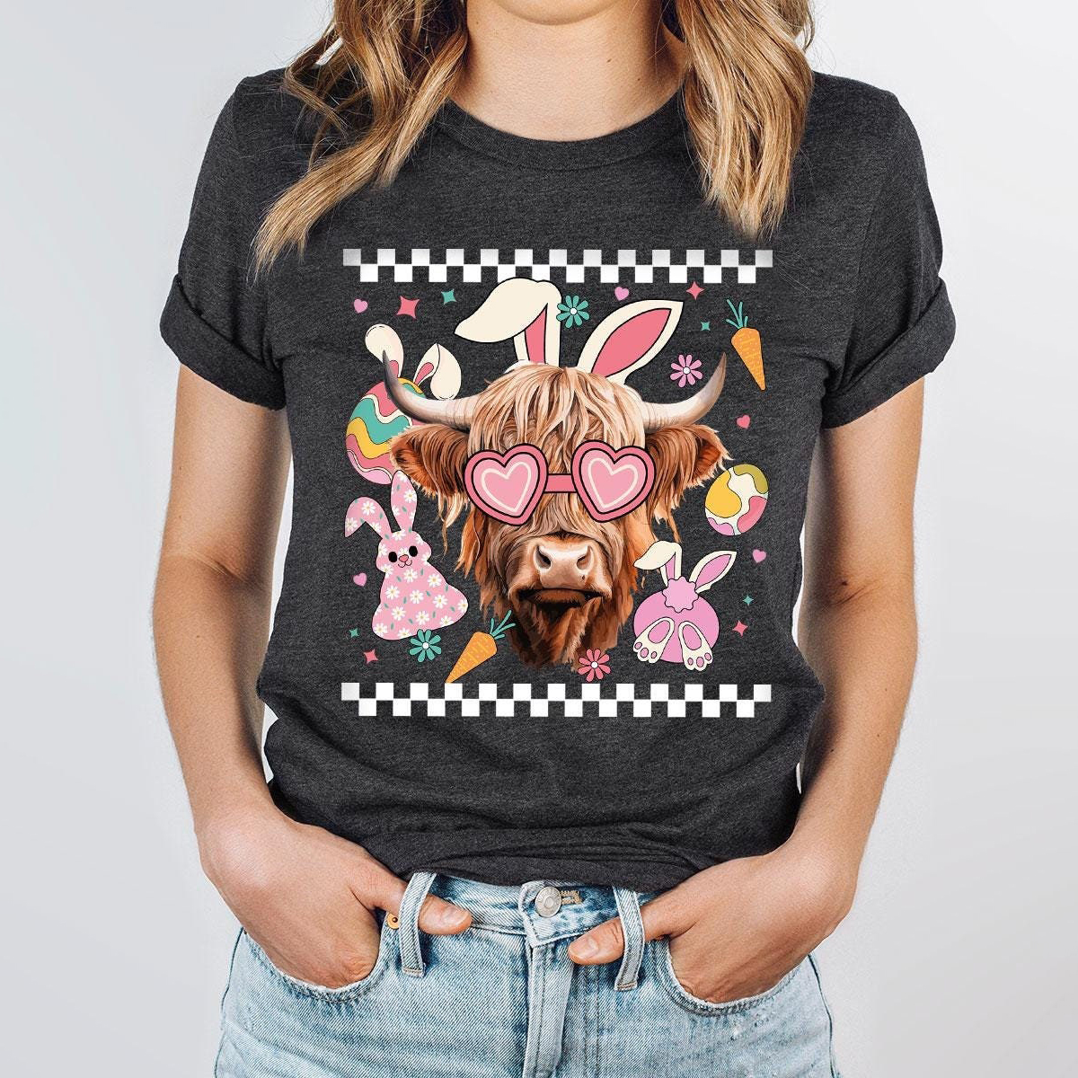 Easter Bunny Highland Cow Eggs Printed Round Neck Short Sleeve T-Shirt