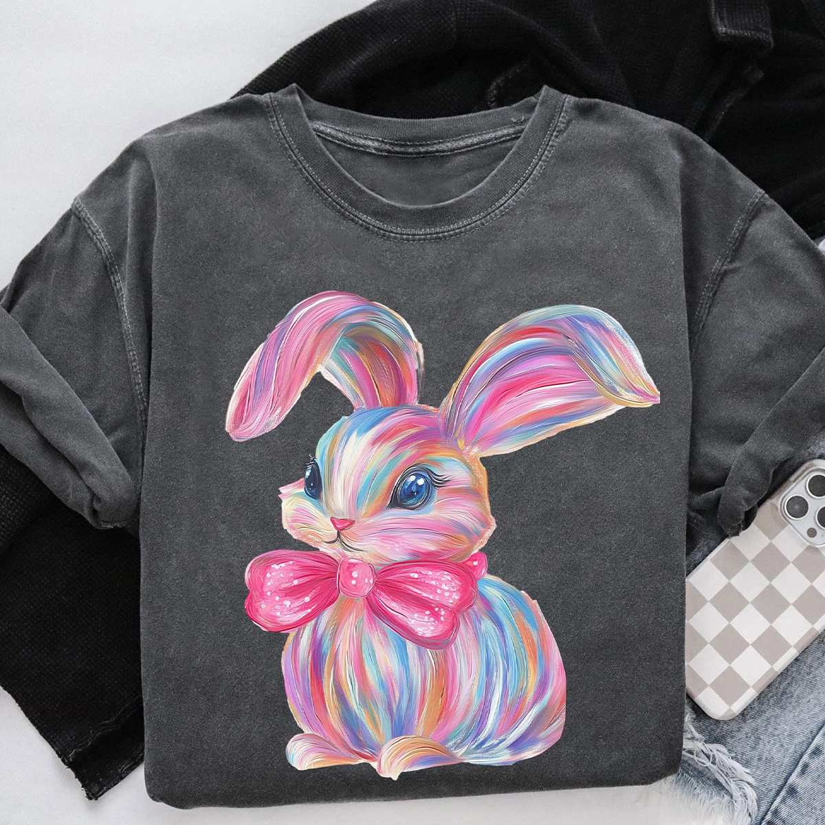 Easter Colorful Bunny Printed Round Neck Short Sleeve T-Shirt