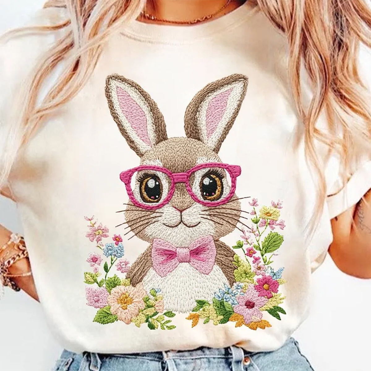 Easter Floral Bunny Printed Round Neck Short Sleeve T-Shirt