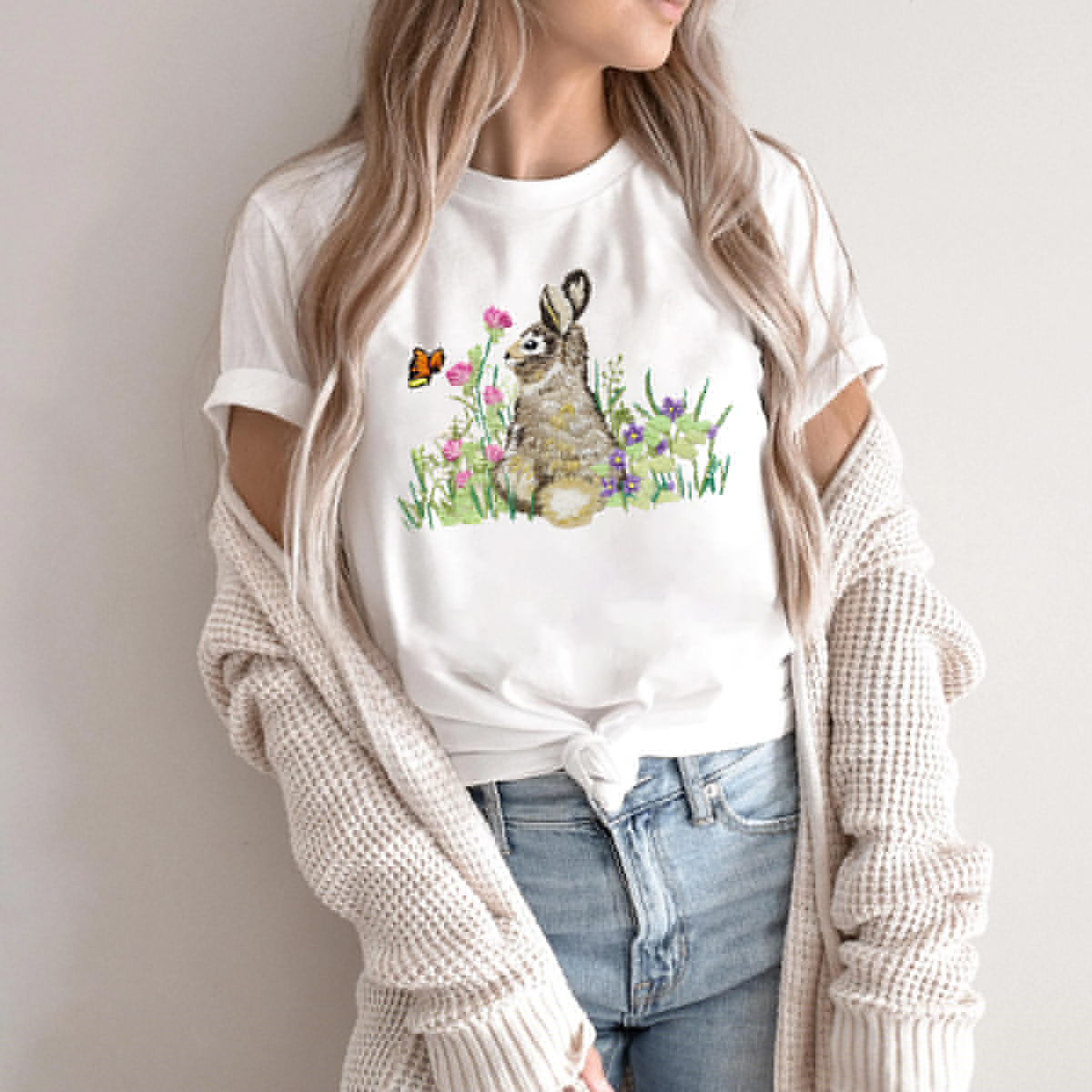 Easter Flowers And Bunny Printed Round Neck Short Sleeve T-Shirt