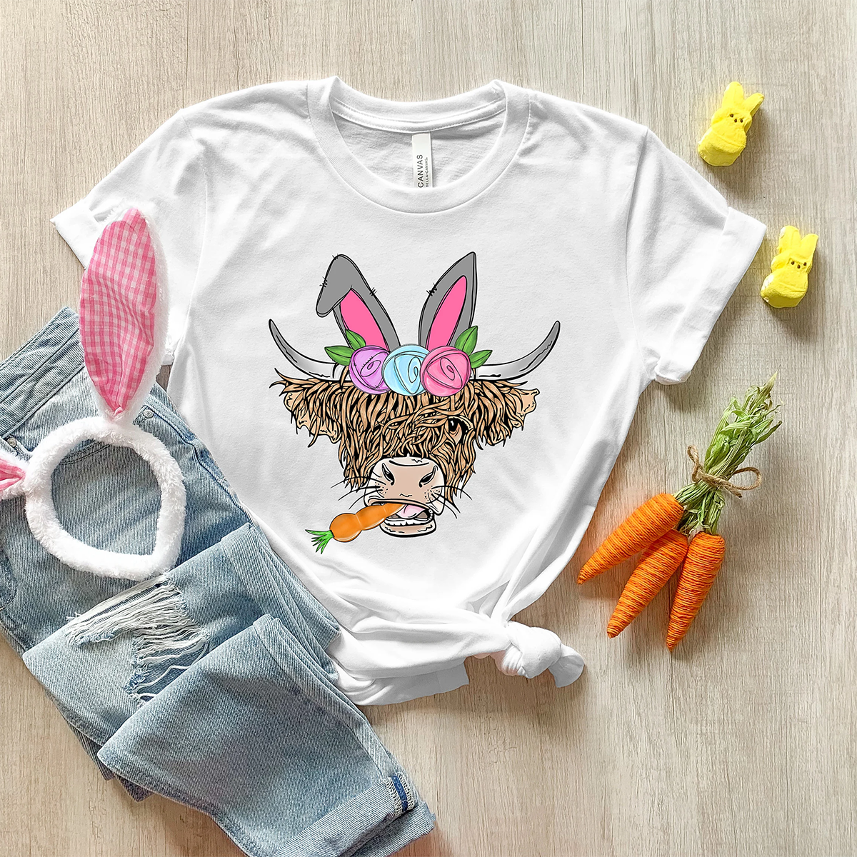 Easter Highland Cattle Printed Round Neck Short Sleeve T-Shirt