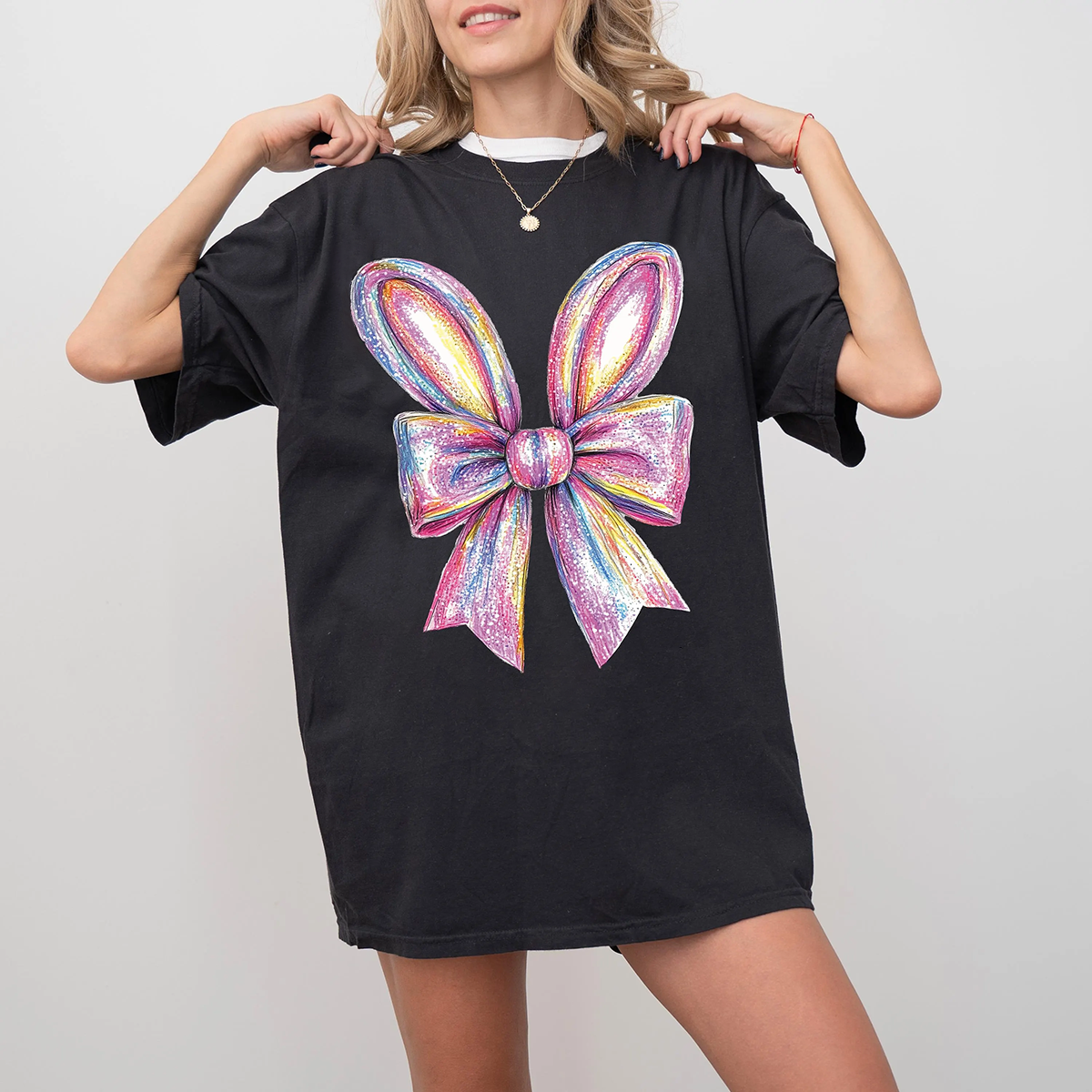 Easter Shiny Bunny Ear Bow Printed Round Neck Short Sleeve T-Shirt