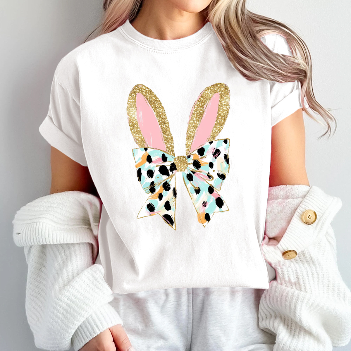 Easter Shiny Leopard Bow Bunny Ears Printed Round Neck Short Sleeve T-Shirt