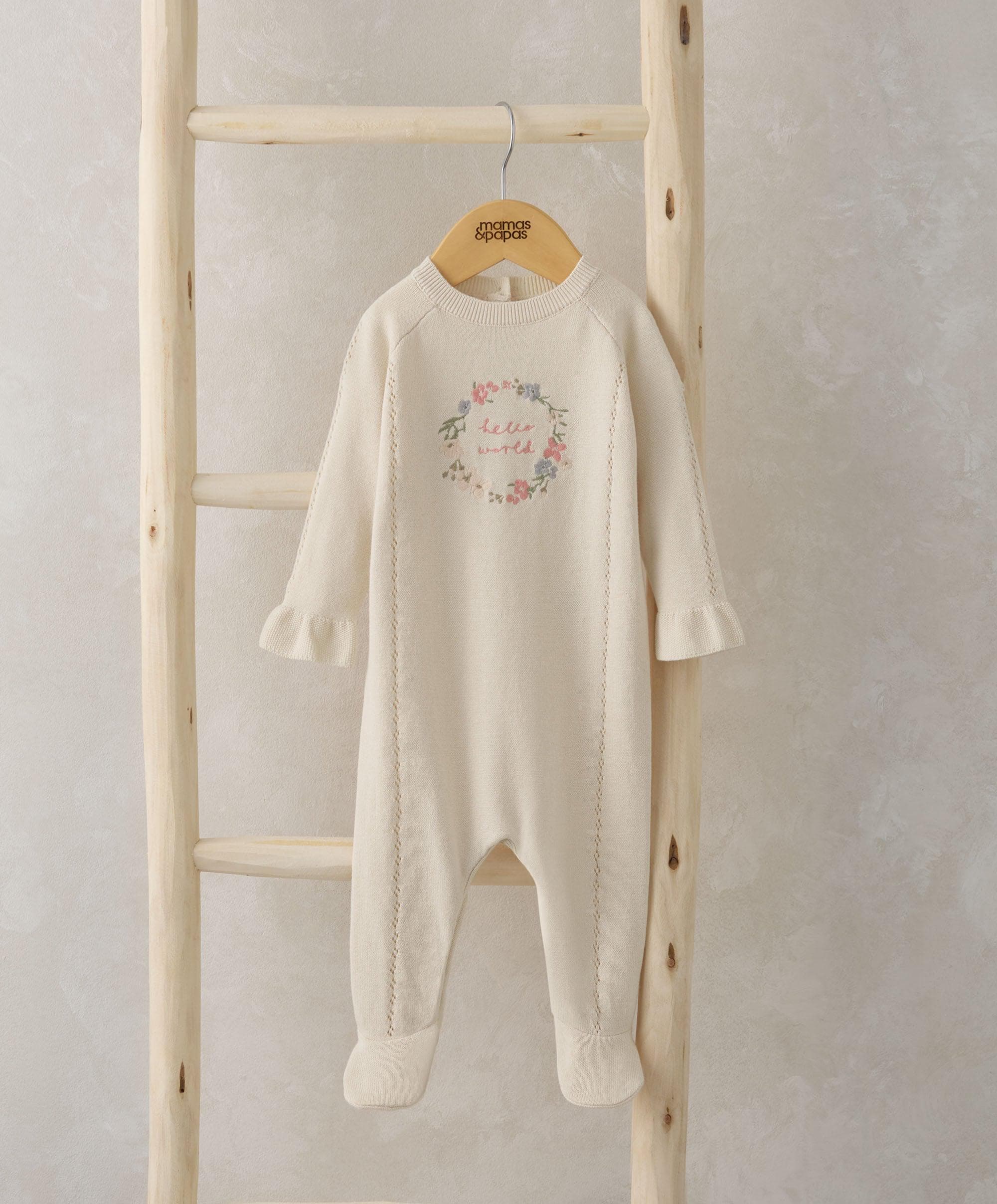 Knitted all in one, oatmeal with 'hello world' embroidered slogan. Frill cuffs and pointelle detail.