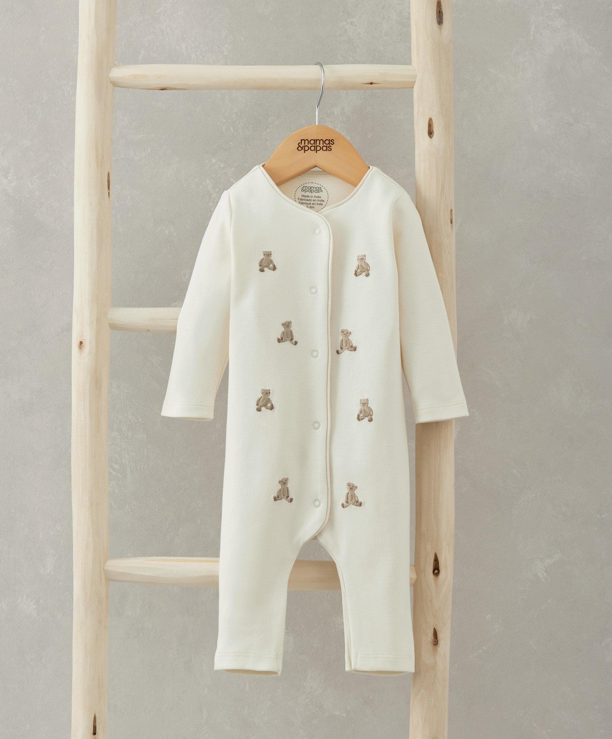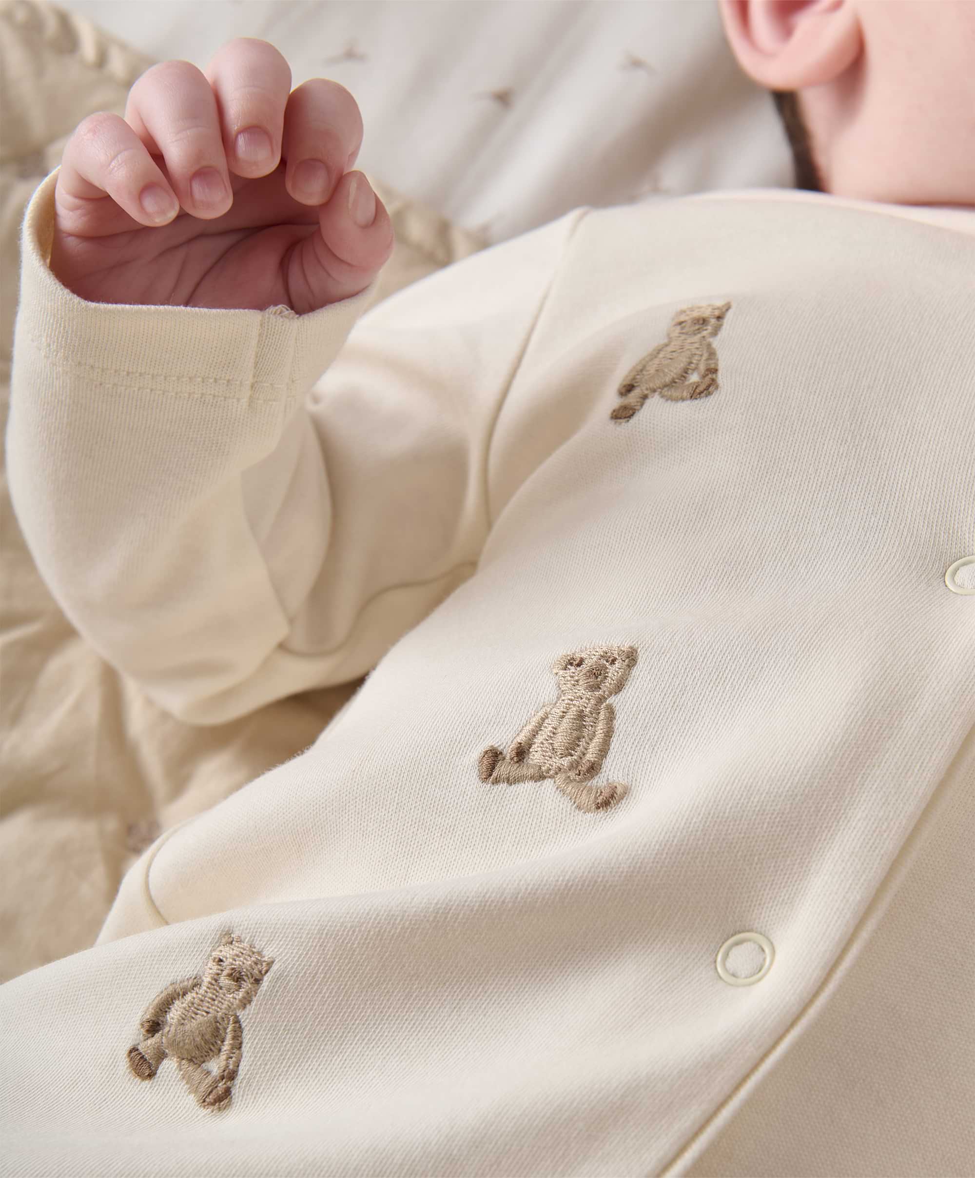 A beautiful romper created from super soft cotton and features classic embroidered bears detail. Popper fastening for quick and easy nappy changes and dressing/undressing.